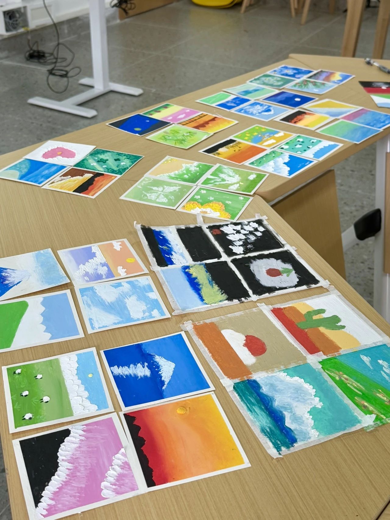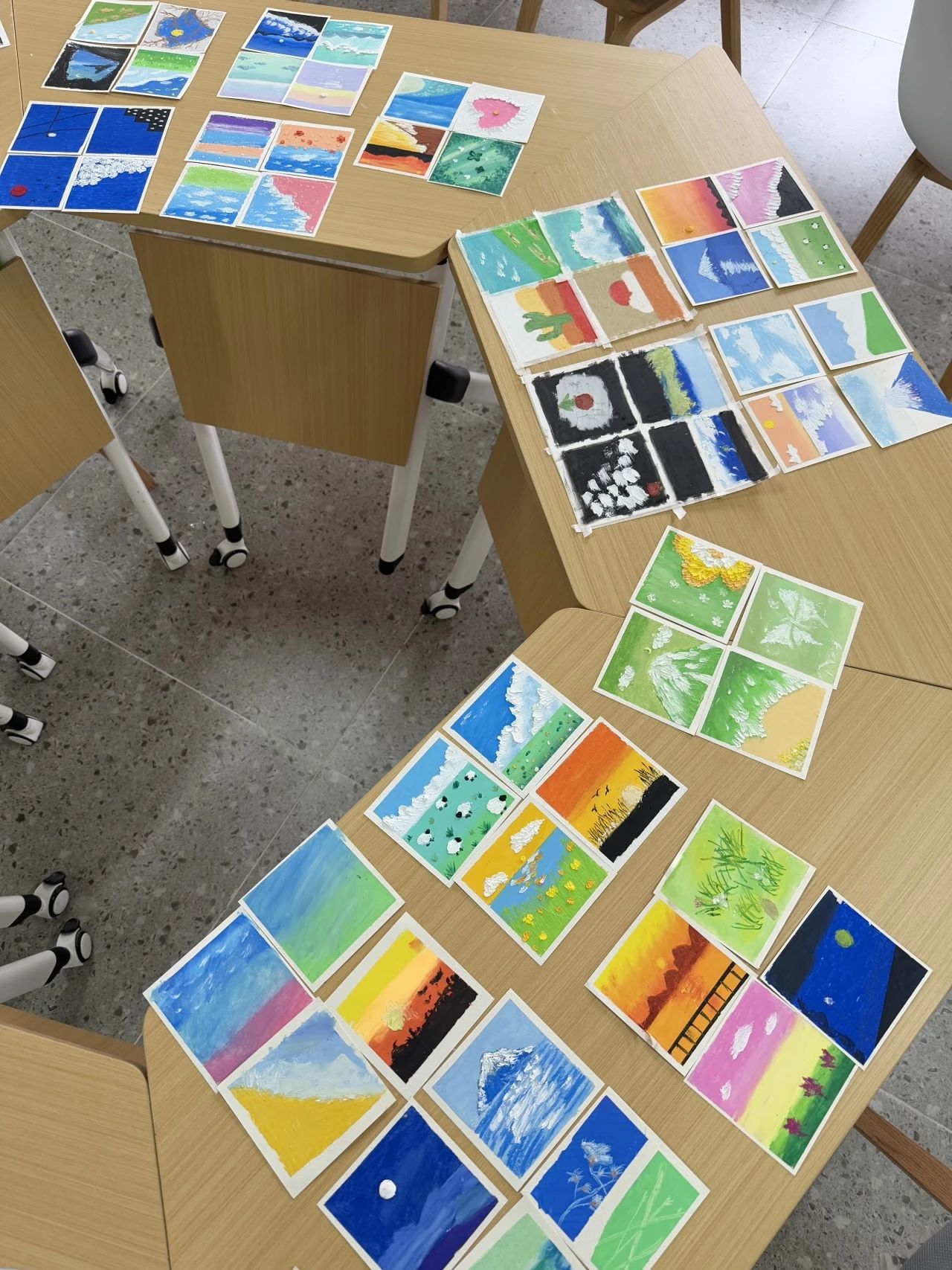 创作完成后,同学们以四宫格的形式展示了自己的油画棒风景画,并互相分享创作心得。有人描绘了记忆中最宁静的角落,有人画出了想象中的理想世界,还有同学通过抽象的色彩表达当下的心情。
