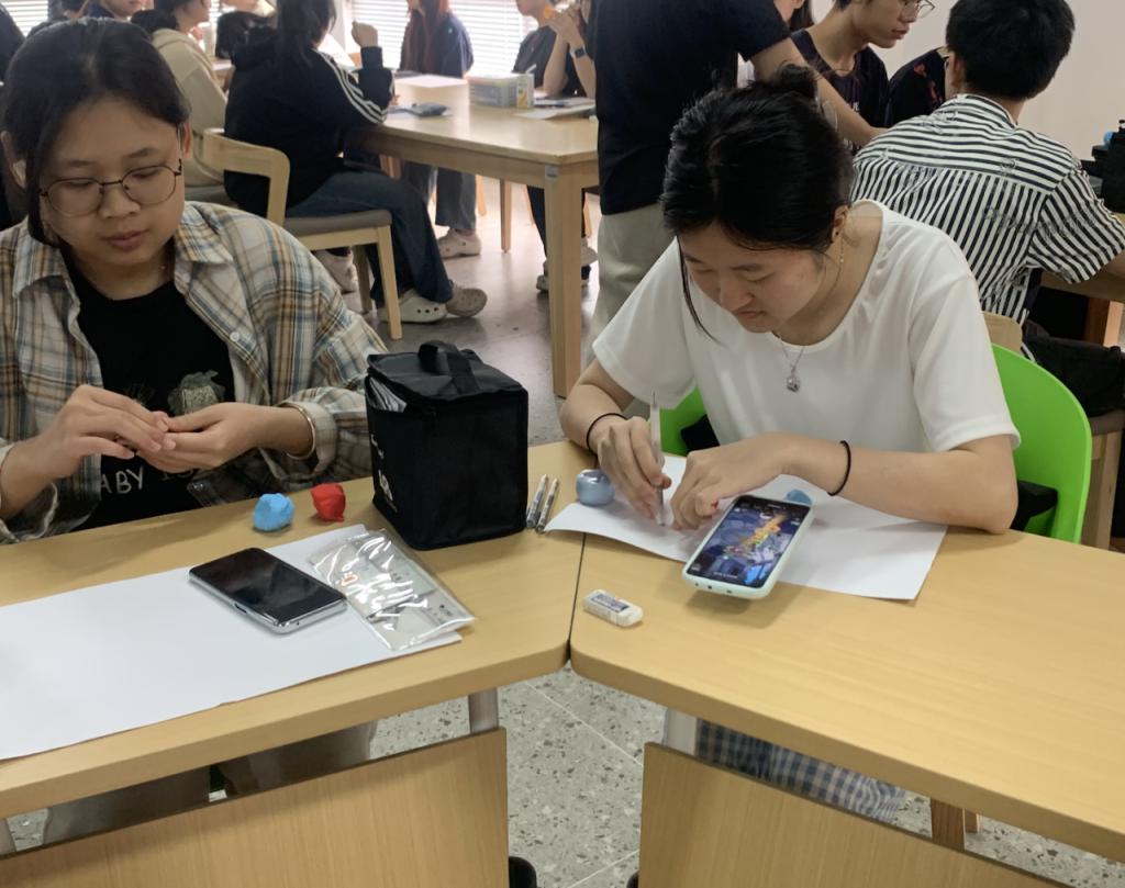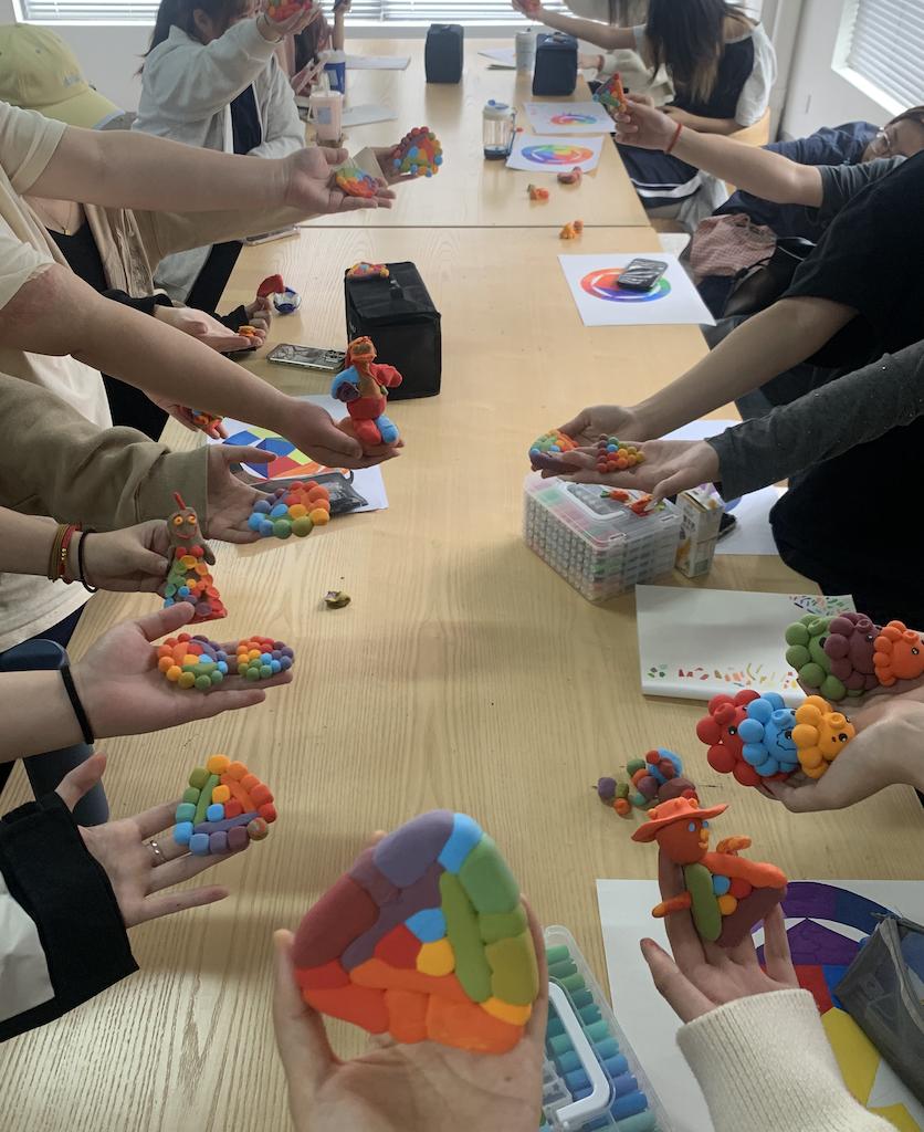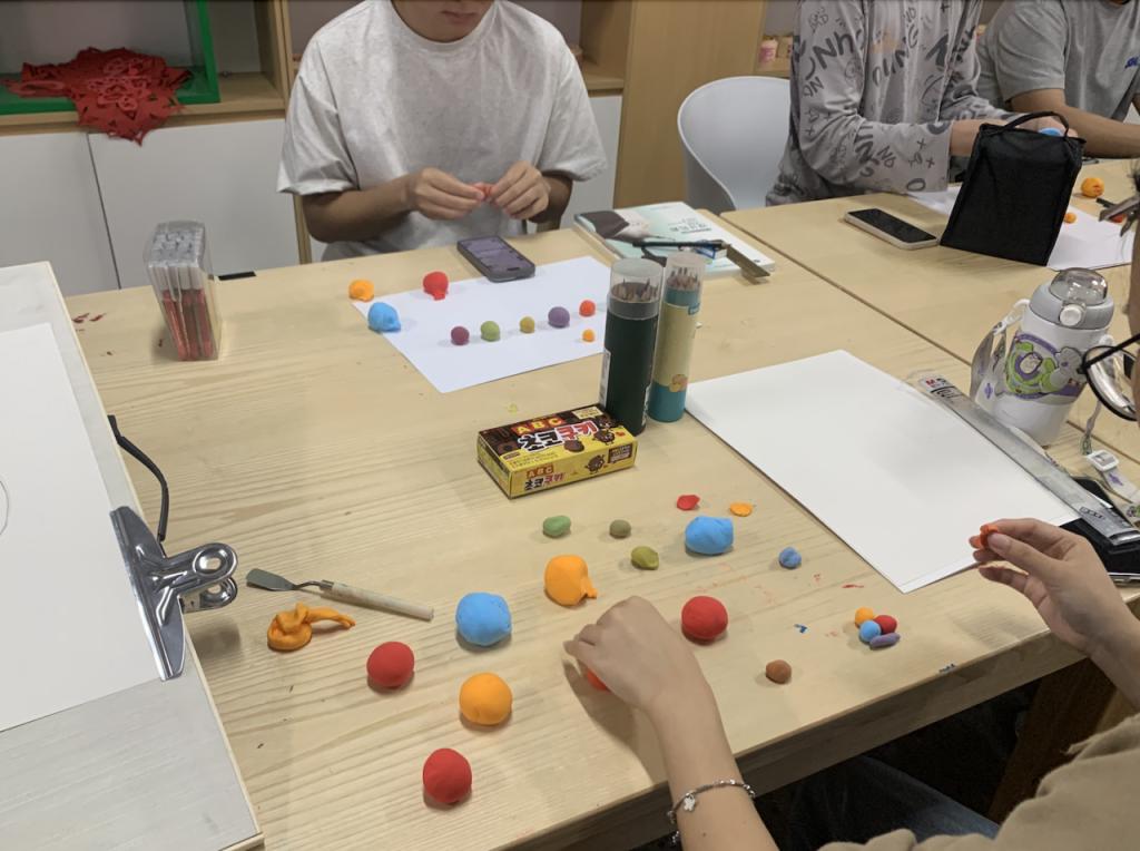 课程从色彩三要素(色相、明度、纯度)、色彩混合规律等核心理论出发,结合色立体模型,帮助学生建立科学的色彩认知框架。在讲解色环基础概念时,为增强学生理解,安排粘土制作环节,学生们通过混合三原色粘土,混出“间色”、“次色”及更多混合色,快速掌握了色环的原理。完成色环制作后,鼓励学生们用剩余材料创作新的作品,这一实践既加深了学生对色环结构的理解,又锻炼了动手能力与色彩搭配技巧。