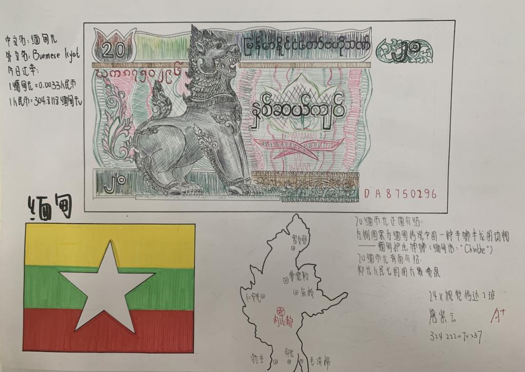 为拓展文化维度,课程引入东方传统色,如敦煌藻井壁画与西方色彩体系的对比教学。西方色彩以各个国家的国旗和当地纸币图饰为例,学生们对不同国家纸币的色彩搭配与图案设计进行自主探究,拓宽了学生的国际视野,使其认识到色彩在不同文化背景下运用的差异。