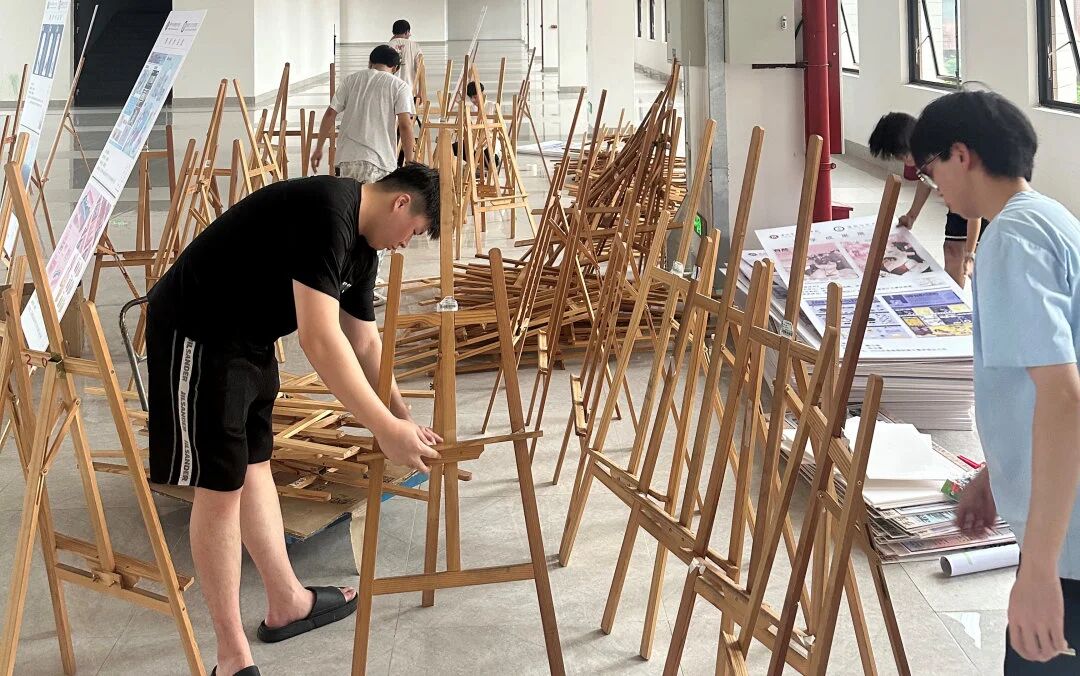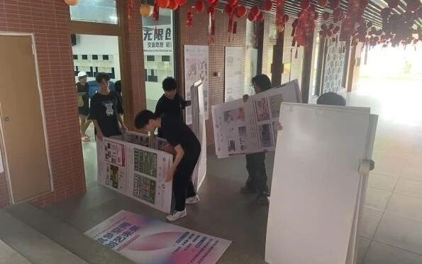 为了这场展览能完美呈现,前期布展工作可谓是一场精心策划的“艺术工程”。教师党支部积极发挥党员先锋模范作用,工作人员们分工协作,小心翼翼地搬运各类艺术作品。展区布置阶段,团队依据设计方案,精确规划每一件作品的摆放位置与间距,每一处细节都反复推敲调整。