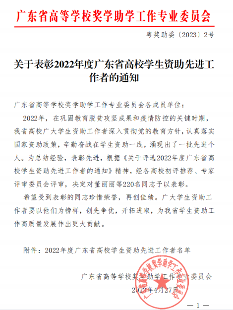 近日,由广东省高等学校奖学助学工作专业委员会公布2022年度广东省高校学生资助先进工作者名单中,我院方毓聪老师荣获“2022年度广东省高校学生资助先进工作者”称号。