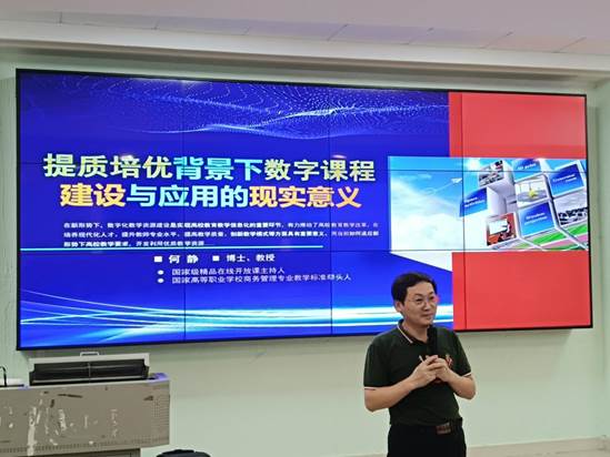 国家级精品在线开放课主持人何静教师做主题为《提质培优背景下数字课程建设与应用的现实意义》的报告。何教授结合具体的课程案例对精品课程的建设目标、建设内容以及课程建设流程和规范进行了详细的剖析,并指出在新形势下,数字化教学资源建设是实现高校教育教学信息化的重要环节,有力推动了高校教育教学改革,在培养现代化人才、提升教师专业水平、提高教学质量、创新教学模式等方面具有重要意义。