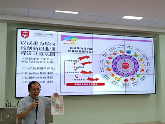 省南粤优秀教师和省课堂革命案例获得者陈宏老师分享主题是《创新创业系列特色教材开发与实践》,分享了其本人主持的6部国家规划的高职双创系列教材的研发经验和成果,并就双创教学“关键五式”教学法做了详细剖析。