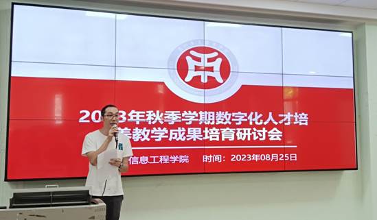 为进一步深化教育教学创新改革,培育和凝练信息工程学院教育教学成果,推动优秀教学研究成果的实践应用,信息工程学院在2023年8月25日博C101举办了2023年秋季学期数字化人才培养教学成果培育研讨会。本次大会特邀国家级精品课程获得者佛山职业技术学院文化旅游创意学院院长何静教授和省南粤优秀教师广东岭南职业技术学院首席创业导师陈宏老师分别给大家进行了精彩的专题培训讲座,全体教师出席了本次会议。