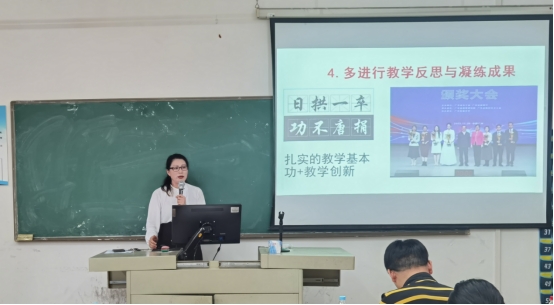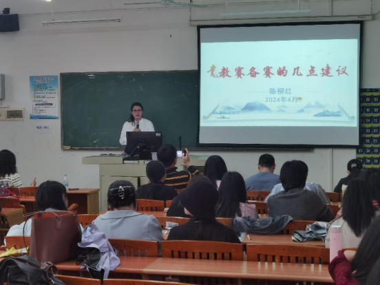 随后,陈柳红老师围绕比赛的赛制、评分标准以及注意事项等方面进行了详细解读。强调课程设计、课堂教学设计、课堂教学资源等方面需注重教学内容的创新性、教学方法的多样性和教学效果的实效性。同时结合之前参加比赛老师遇到的困难、疑问及最终获得比赛名次的成就,再次鼓励青年教师应积极参与比赛,“日拱一卒,功不唐捐”将每次参赛视作一次锻炼的机会,不断向前,终获成功。