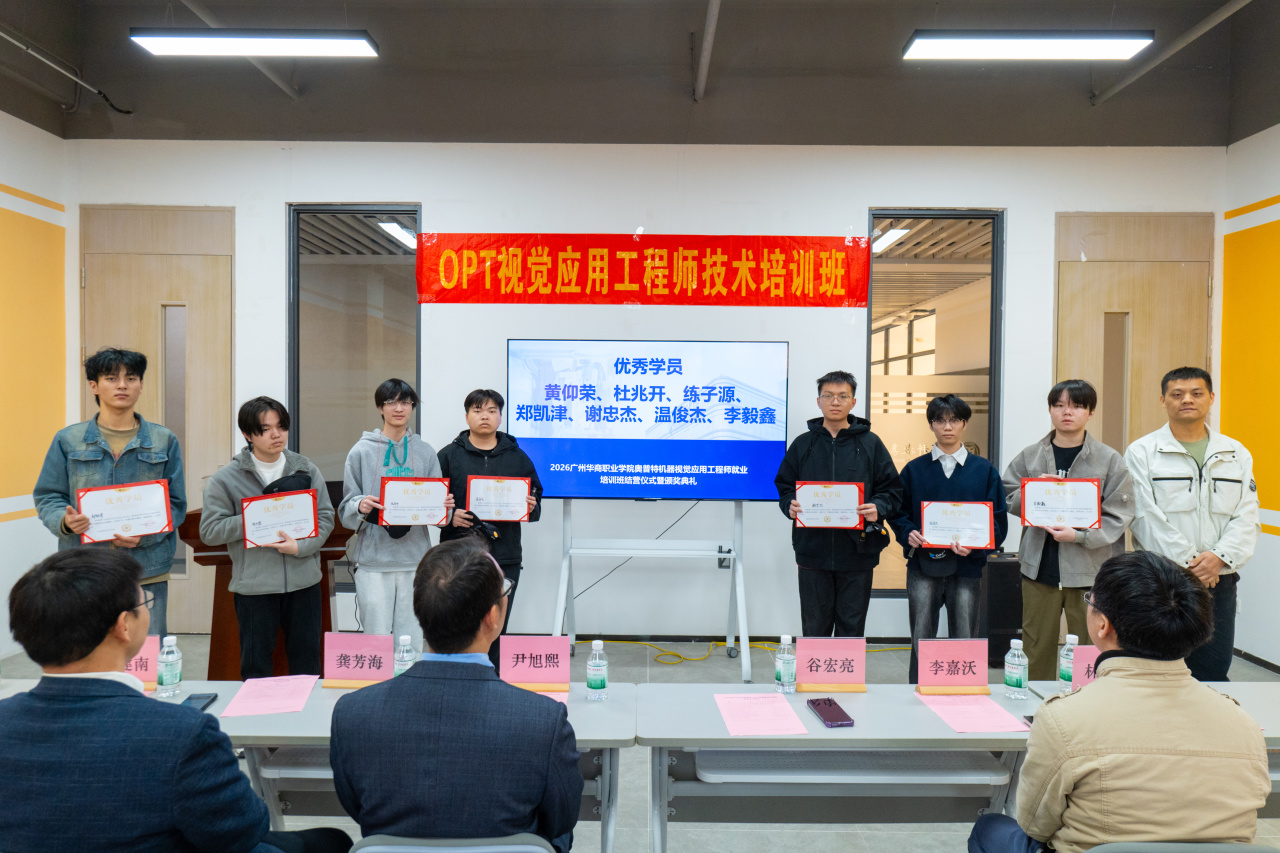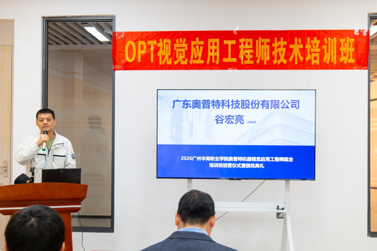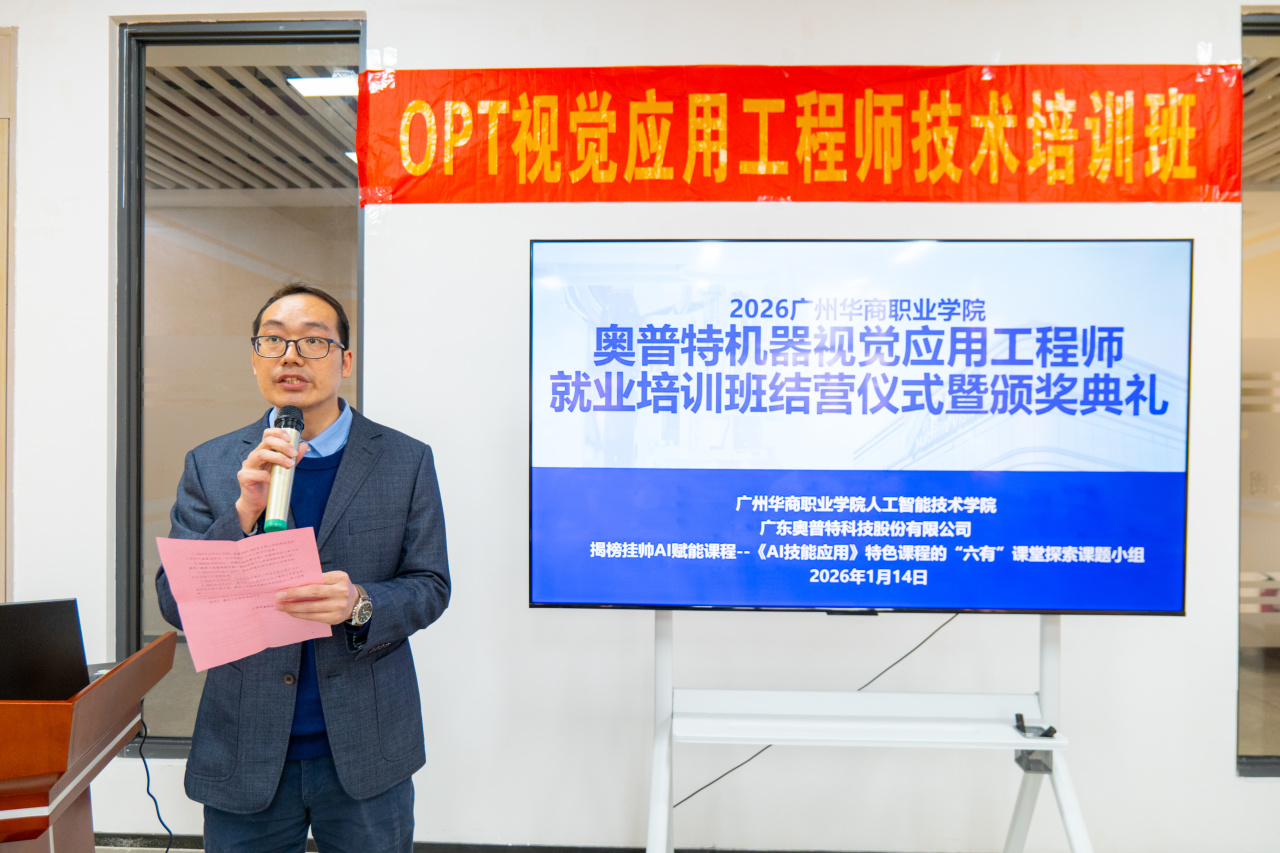 广东奥普特科技股份有限公司谷宏亮总监表示,机器视觉技术是智能制造的“核心感官”,是工业智能化升级的核心支撑。奥普特自研的 Smart 智能视觉软件等产品已广泛应用于 3C、汽车等行业,本次培训立足企业真实岗位需求,实现基础操作到方案实操的全链条覆盖。他肯定了同学们的求知热情与实操潜力,期待以此次合作为起点,深化校企联动,未来开放更多项目资源与实践岗位,助力学子成长为行业实用型人才,同时祝贺培训圆满落幕,寄语同学们以技术为翼,在智能制造领域崭露头角。