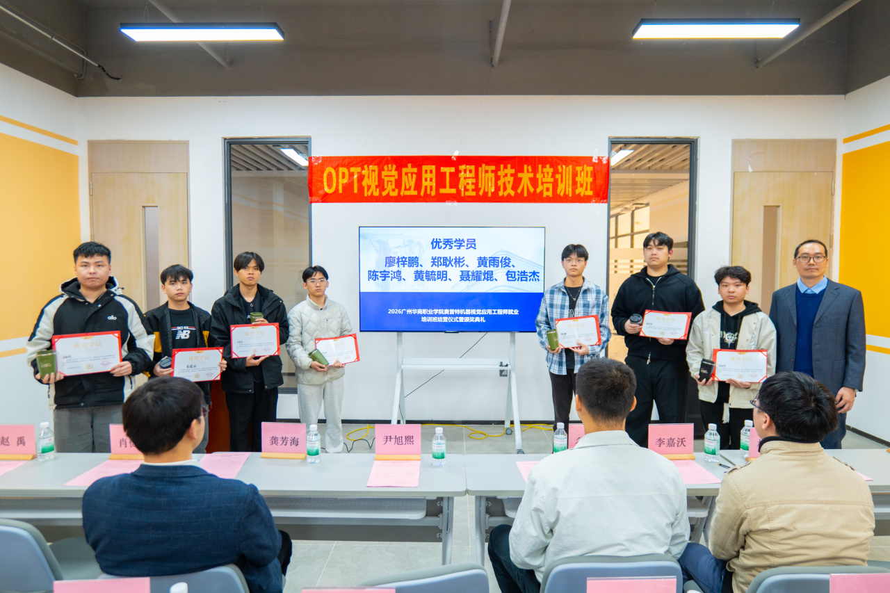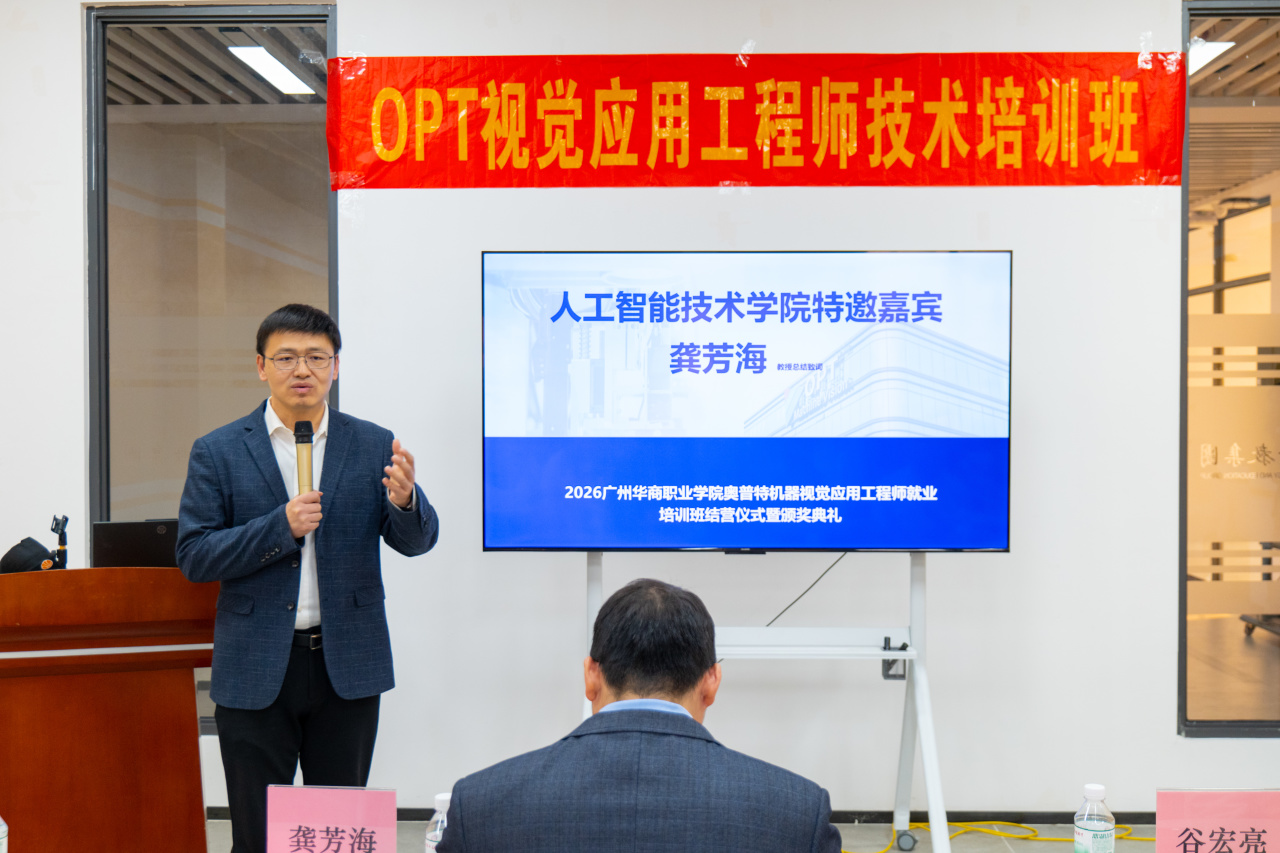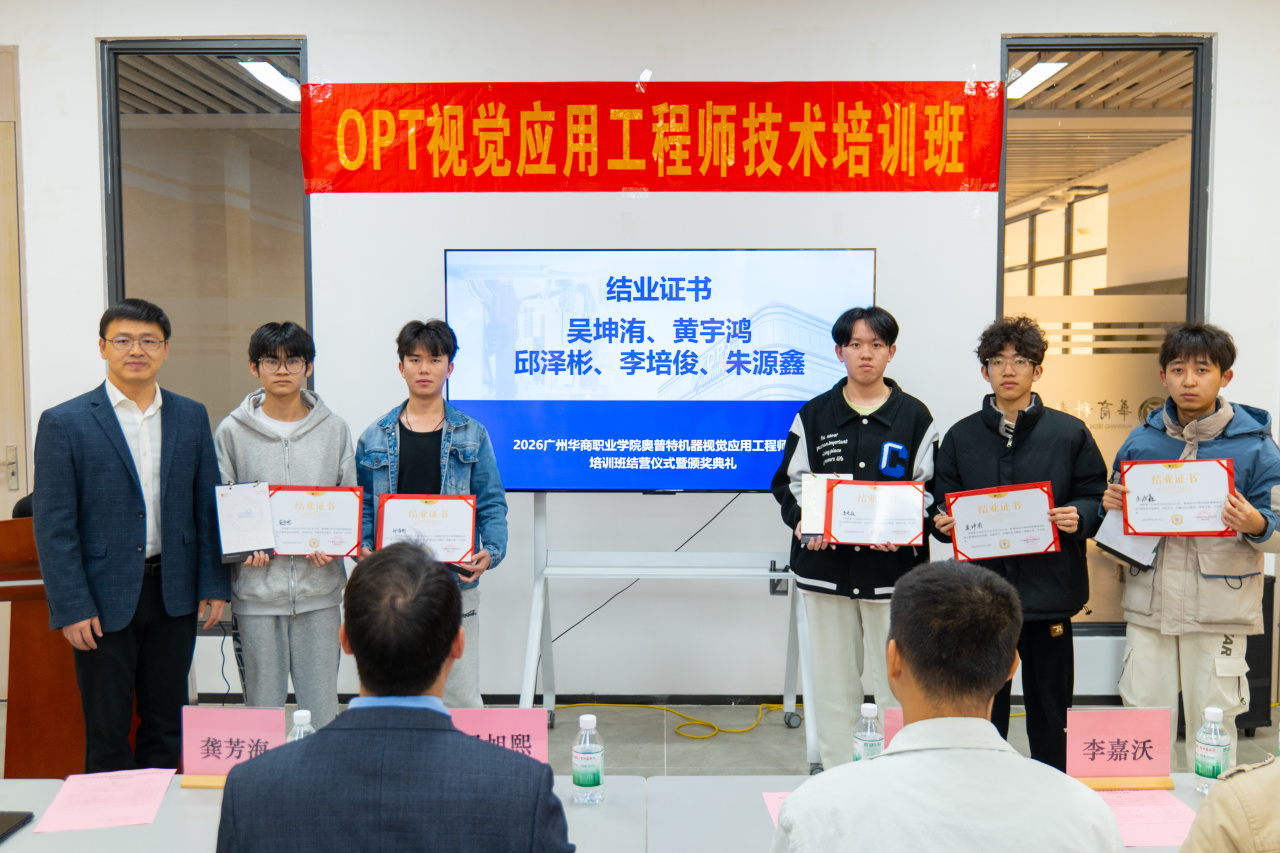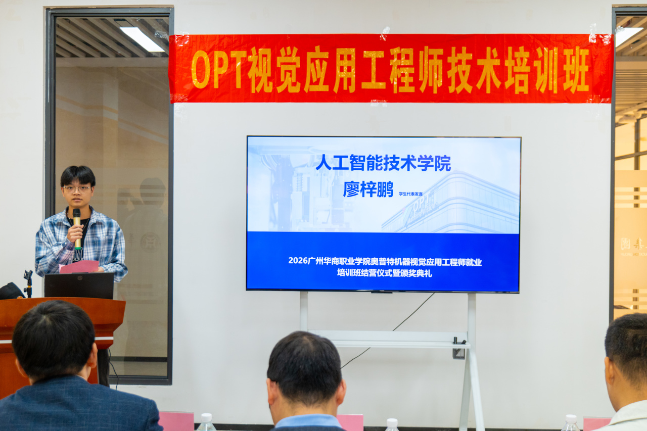 广东奥普特科技股份有限公司谷宏亮总监表示,机器视觉技术是智能制造的“核心感官”,是工业智能化升级的核心支撑。奥普特自研的 Smart 智能视觉软件等产品已广泛应用于 3C、汽车等行业,本次培训立足企业真实岗位需求,实现基础操作到方案实操的全链条覆盖。他肯定了同学们的求知热情与实操潜力,期待以此次合作为起点,深化校企联动,未来开放更多项目资源与实践岗位,助力学子成长为行业实用型人才,同时祝贺培训圆满落幕,寄语同学们以技术为翼,在智能制造领域崭露头角。