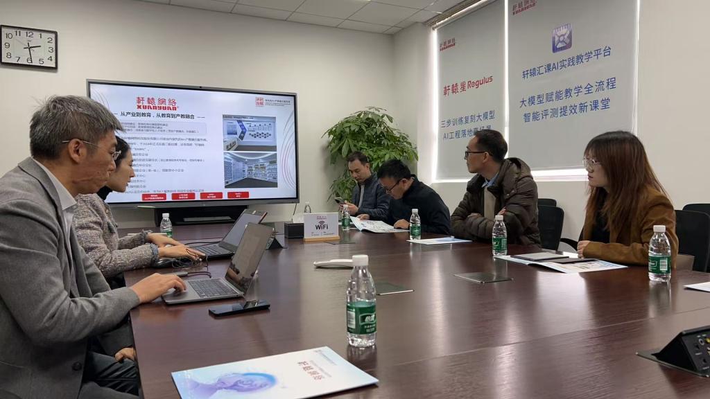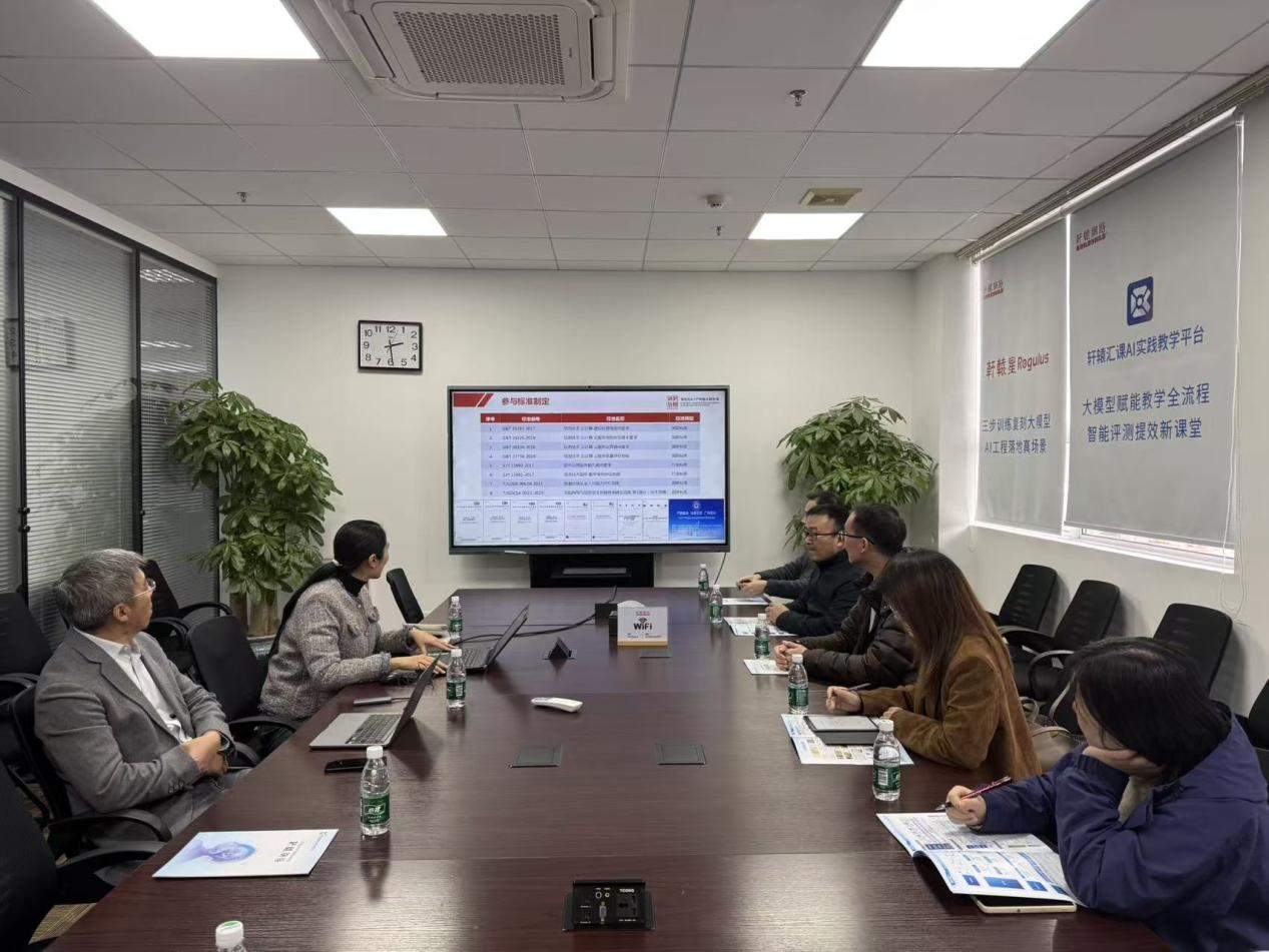 介绍结束后,双方展开靶向性交流。轩辕网络负责人带领学院一行参观了技术研发中心与AI实训展示区,现场演示“轩辕汇课AIGC实战平台”的多场景应用,结合高校教学痛点,说明平台可适配分层教学,提供全阶段实训支撑。同时,负责人结合粤港澳大湾区AI产业布局,强调市场急需大模型应用与场景落地复合型人才,建议学院强化项目化实训比重,为人才培养锚定方向。