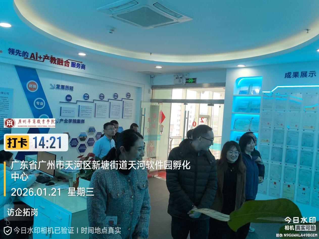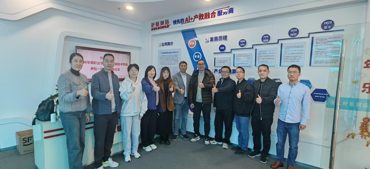 为深化AI领域产教融合,精准对接行业人才需求,推进专业建设提质增效,2026年1月21日,广州华商职业学院人工智能技术学院主持工作副院长尹旭熙带领肖健南、张国萍等骨干教师一行,赴广东轩辕网络科技股份有限公司(以下简称“轩辕网络”)开展访企拓岗交流,双方围绕AI专业建设、实训平台共建、人才联合培养等核心议题深入洽谈,达成系列合作共识。