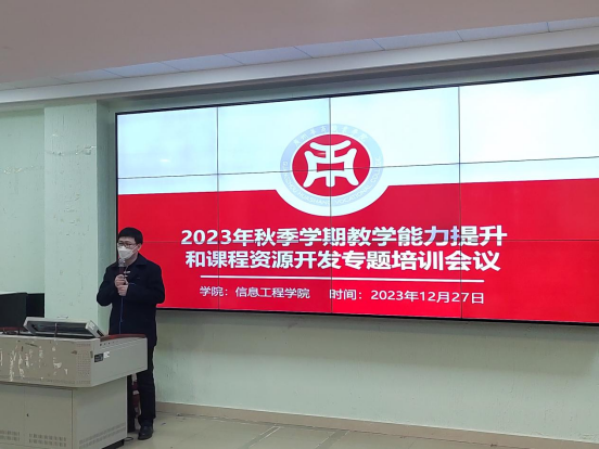 为进一步深化教育教学创新改革,培育和凝练信息工程学院教育教学成果,推动优秀教学研究成果的实践应用,信息工程学院在2023年12月27日下午在博C101举办了教学能力提升和课程资源开发专题培训会议。本次大会特邀广东农工商职业技术学院计算机学院院长李蓉教授和佛山职业技术学院高级工程师臧艳辉分别给大家进行了精彩的专题培训讲座,全体教师出席了本次会议。