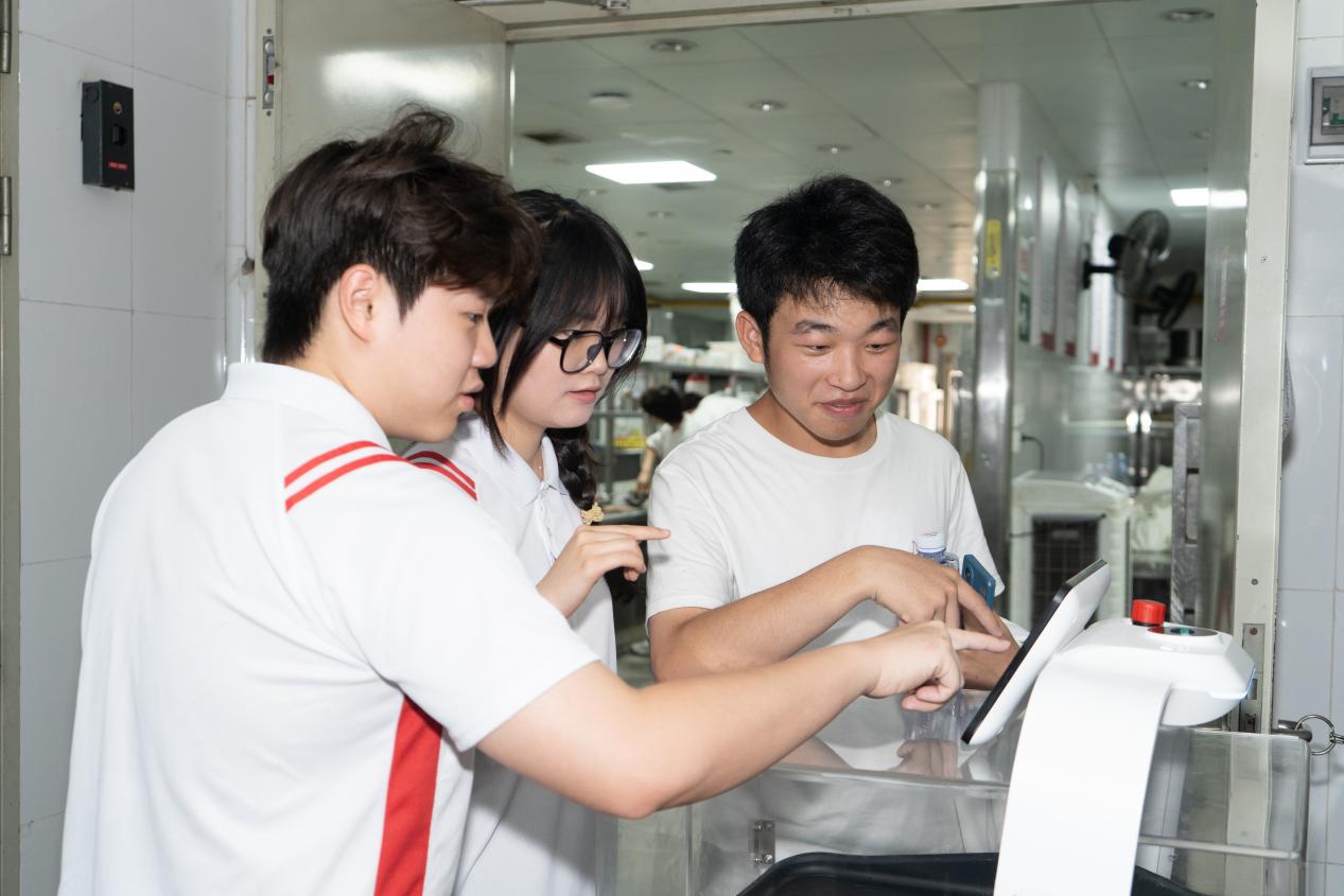 大家抵达太阳城教学酒店。在刘老师的热情引导下,同学们先后参观了酒店的前台咨询智能机器人和送餐智能机器人。酒店工作人员为同学们进行详细解说,不仅介绍了这些智能机器人的基本功能,如自主导航、物品配送、信息交互等,还讲解了机器人的设置及操作流程,让同学们对其工作原理有了初步认识。在演示环节,同学们更是兴奋不已,跃跃欲试,纷纷现场尝试操作使用机器人,亲身体验科技带来的便捷与乐趣,切实感受到智能机器人在酒店服务中的实际应用价值。