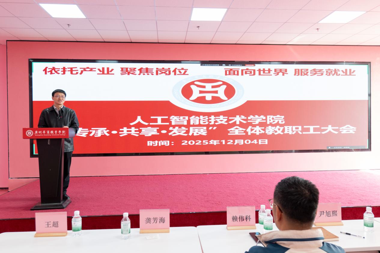 为凝聚全院共识,共绘人工智能技术学院高质量发展新蓝图。12月4日,我院召开“传承·共享·发展”全体教职工大会。学院领导班子、广州校区及江门校区全体教职工参加会议。会议由办公室主任肖健南主持。