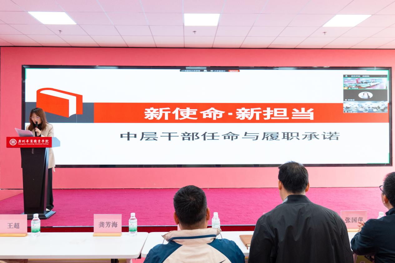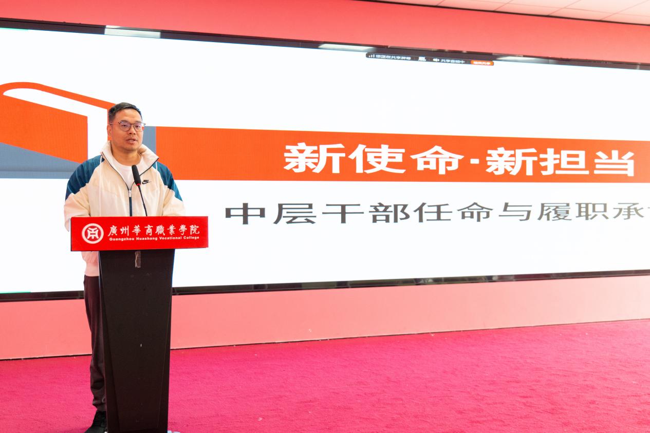 使命在肩,干部先行。会议首先进入学院新一轮中层干部履职表态环节。尹旭熙副院长(主持工作)、欧曼芸副院长、赖伟科副院长依次宣读履职承诺书,围绕“学院内涵建设”,立下“任期目标军令状”,以“起跑即冲刺”的姿态吹响干事创业新号角。