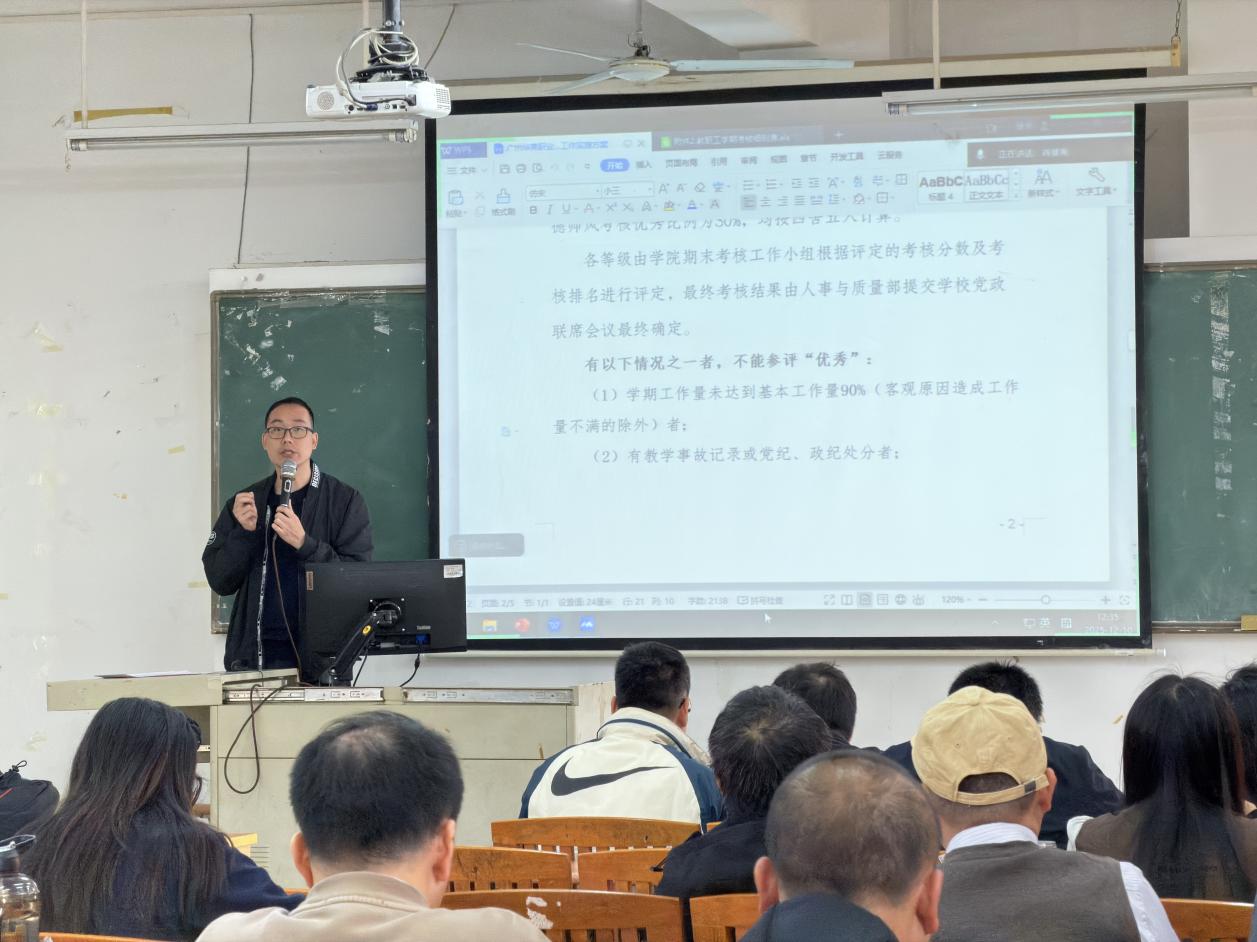 尹副院长详细介绍了不同岗位类别(教研室主任/专业负责人、专任教师、行政人员、辅导员)的考核内容与评分方式,并结合考核细则表,对考核指标、评分标准、材料报送等环节作出具体说明。他指出,新学期考核将进一步优化评价体系,强化激励作用,引导教职工聚焦立德树人根本任务,提升教育教学与科研服务水平。