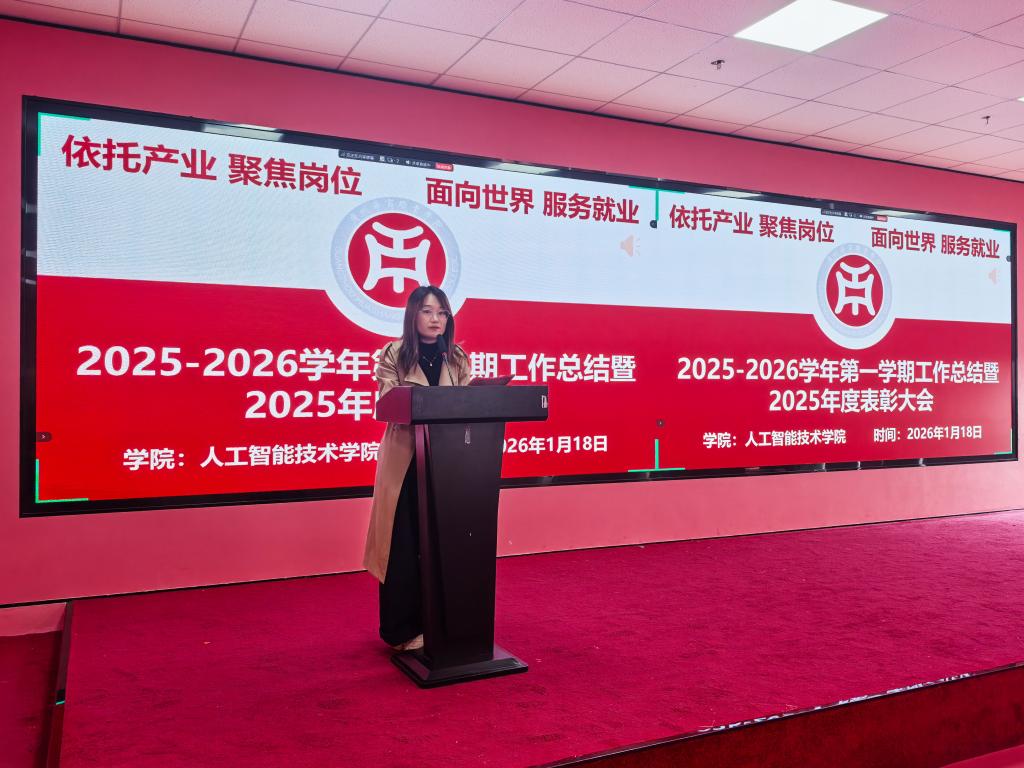 岁序更替启新程,凝心聚力谱华章。2026年1月18日,人工智能技术学院隆重召开2025-2026学年第一学期工作总结暨2025年度表彰大会。大会以“依托产业 聚焦岗位 面向世界 服务就业”为导向,全面复盘学期工作成效,表彰先进典型,凝聚全院力量,为新一年的发展注入强劲动力。