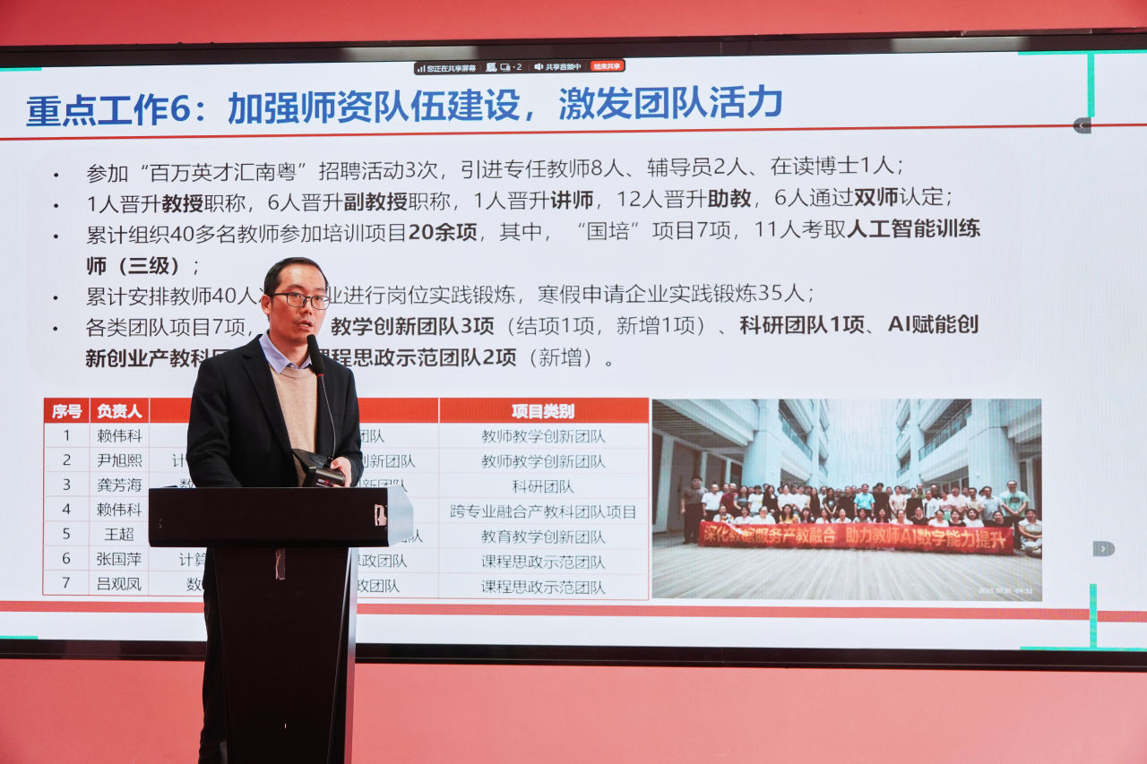 赖伟科副院长围绕分管教学工作汇报,他重点复盘了核心教学任务的落实成效:课堂革命试点项目扎实推进,3个试点班级形成可复制的教学模式,有效提升课堂互动性与教学效率;10项AI赋能课程顺利完成中期检查,课程资源持续迭代优化,助力数字化教学转型;3个微专业成功立项落地,数量居全校首位,进一步完善了专业人才培养体系。同时,赖副院长就后续教学工作明确了具体推进举措,提出要持续优化教学资源配置,升级现有实训室功能、扩充精品课程储备,着力强化师资队伍能力建设,搭建教学技能培训、以赛促教交流等优质平台,鼓励教师深耕教学改革、积极投身课题研究,始终以教学质量提升为核心抓手,凝聚全院上下聚焦教学主业、深耕内涵发展的强大奋进共识。