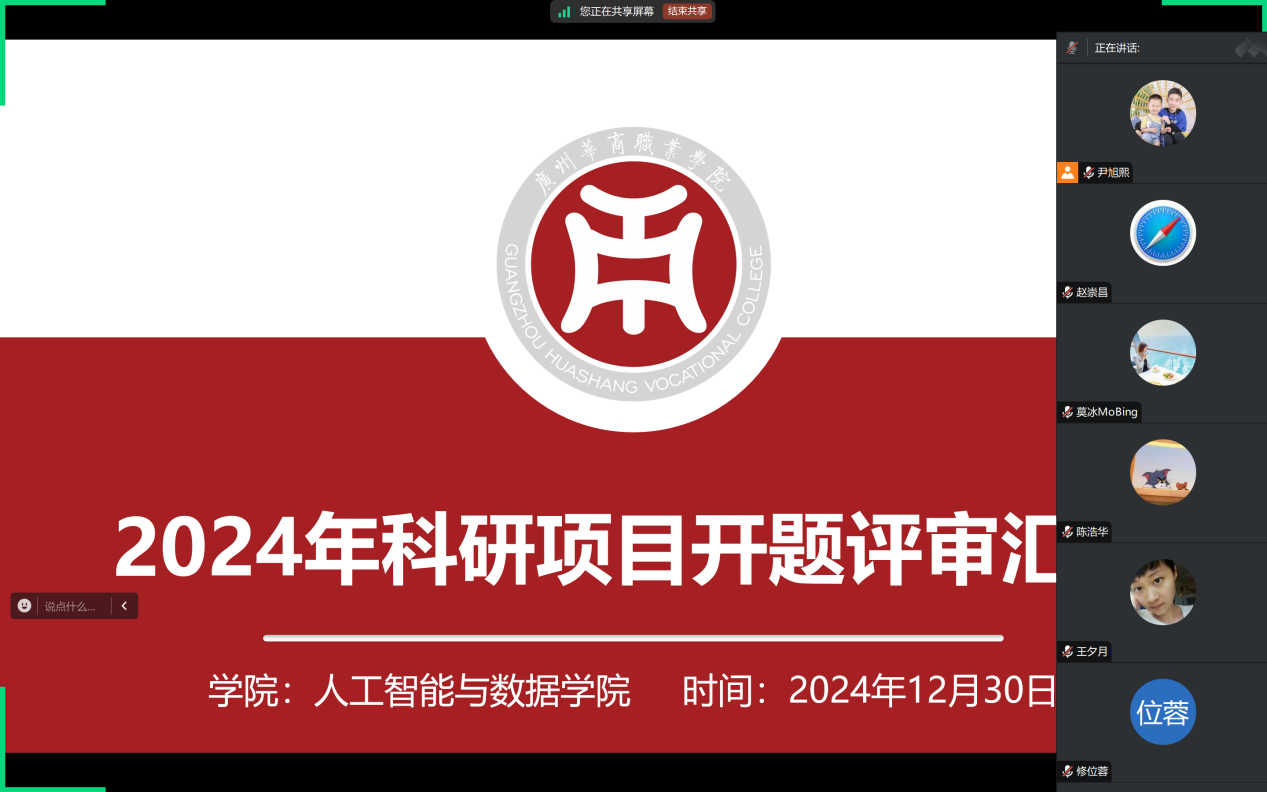 为推动我院科研工作的深入发展,确保新立项科研项目能够顺利开展并取得预期成果,根据华职教研〔2024〕123 号《关于组织开展 2024年科研项目开题评审工作的通知》的相关工作要求,我院于2024年12月30日19:30-22:00开展对2024年新立项的科研项目组织开题评审工作,参会人员包括龚芳海院长、尹旭熙副院长、校外专家和项目主持人,采取线上腾讯会议方式。