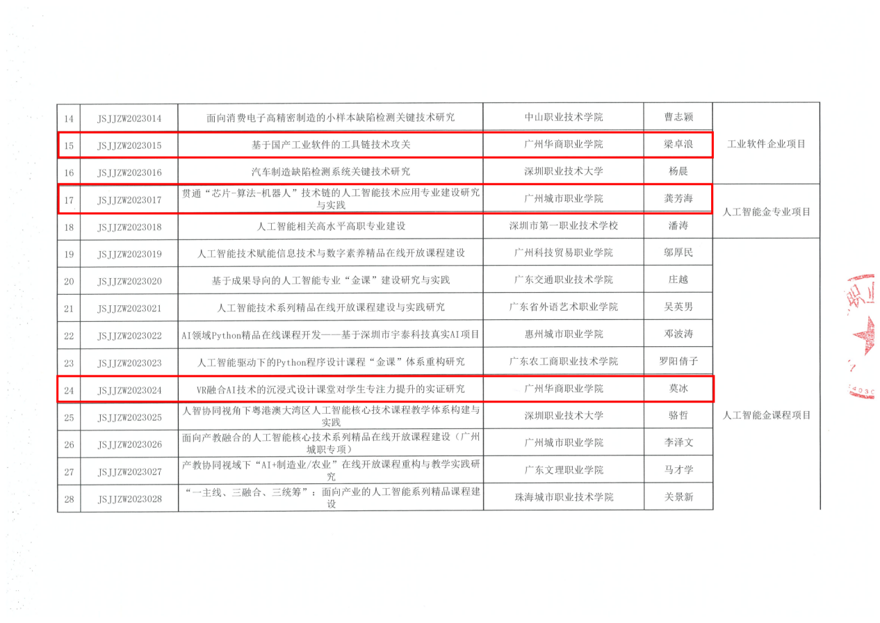 近日,广东省职业学校电子信息与通信类专业教学指导委员会、计算机类专业教学指导委员会、创新创业教育工作指导委员会相继公布了2025年度教育教学改革研究与实践项目立项结果。人工智能技术学院在此次申报中表现突出,累计八项课题成功获得立项,涵盖人工智能赋能课程建设、岗课赛证创融合、国产工具链攻关、创新创业育人模式等多个方向,充分体现了学院在推进人工智能赋能教学改革和融合技术创新方面的扎实研究与实践能力。