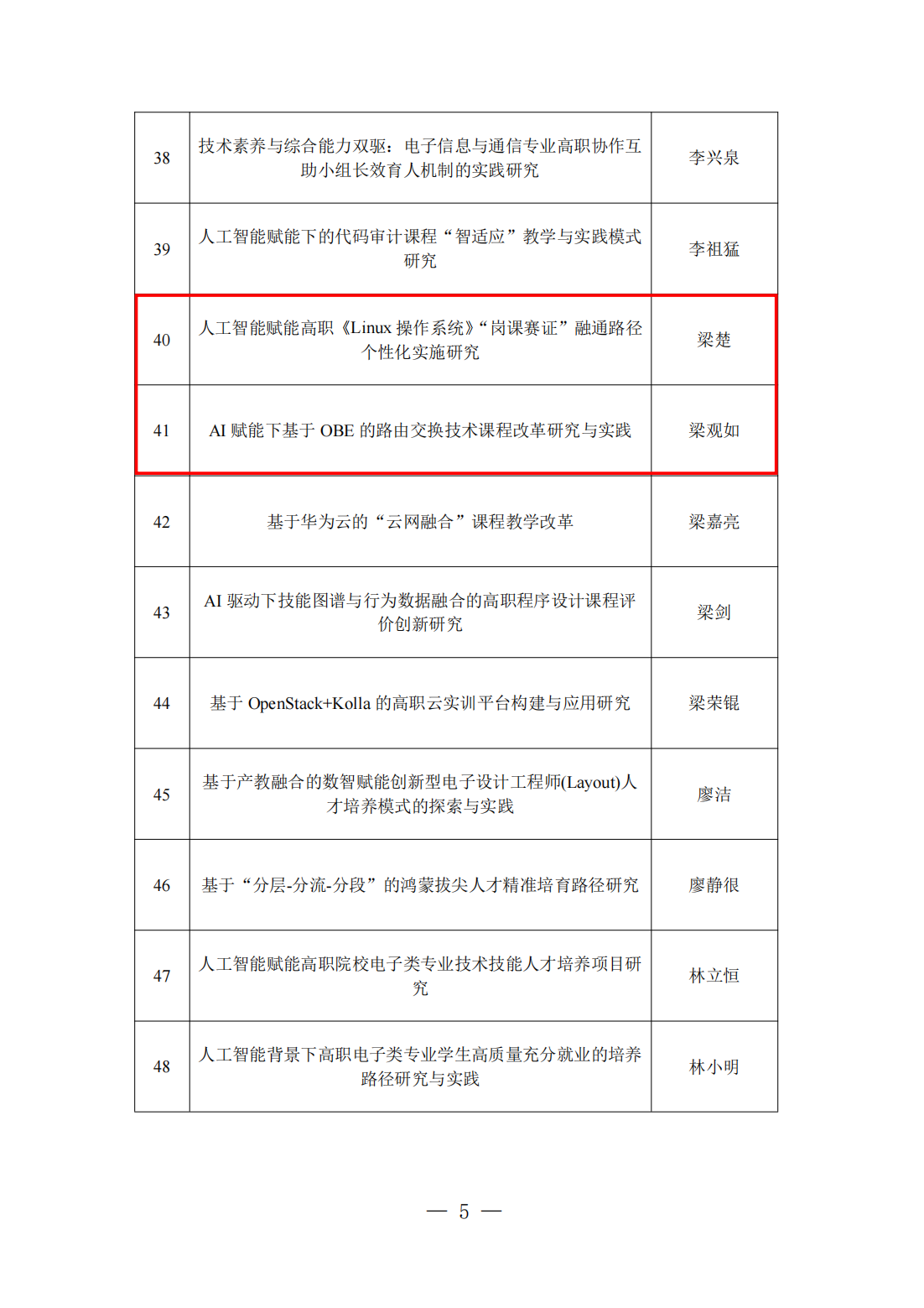 2.梁观如老师主持《AI赋能下基于OBE的路由交换技术课程改革研究与实践》