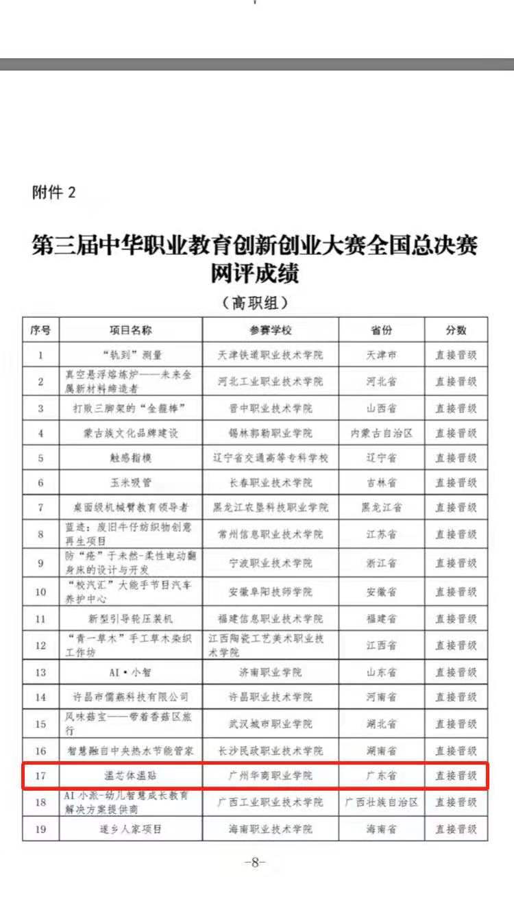 第三届中华职业教育创新创业大赛举办以来,共有26个项目报名参加第三届中华职业教育创新创业大赛广州华商职业学院选拔赛,我院先是由《自然视界农庄》、《温芯体温贴》、《VR感受家》三个创新创业项目经过校内盲审入选校赛。其中《温芯体温贴》脱颖而出,荣获中华职业教育创新创业校赛决赛一等奖参加全国赛网评,由梁绍宇老师和吴仕坚老师指导的《温芯体温贴》创新创业项目一路披荆斩棘,顺利通过晋级全国总决赛,即将前往安徽参加国赛。