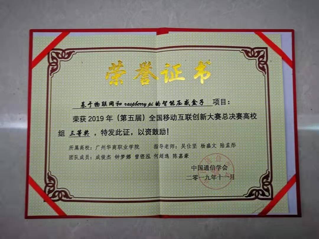 2019年11月17日,在北京举行的全国移动互联网创新大赛总决赛中,经过激烈的角逐,由我院吴仕坚老师指导的创新创业项目——《基于物联网和raspberry pi的智能压感盒子》斩获全国三等奖,展现了信息工程学院创新创业的风采。