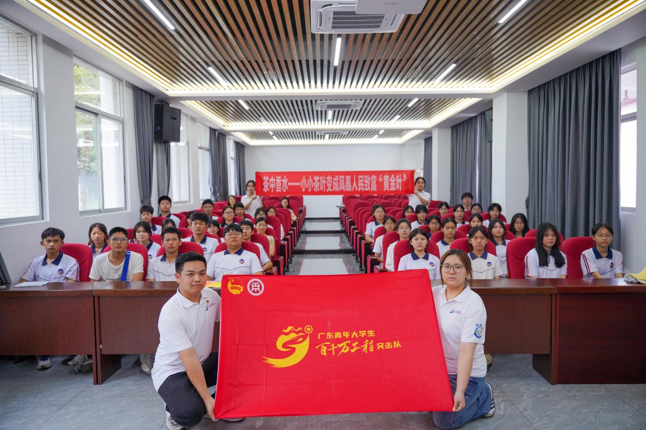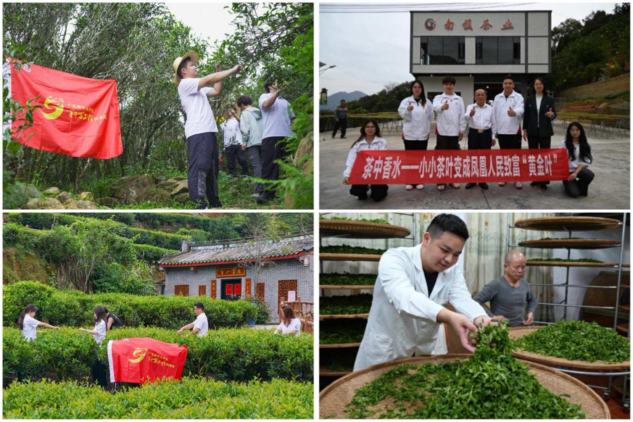 荣誉的背后,是我校学子扎根乡土、躬身实践的动人身影。“茶中香水”团队多次奔赴潮州市凤凰镇,开展实践活动。今年暑期,更是以项目团队为基础组建“百千万工程”突击队赴潮州市凤凰镇开展“三下乡”实践行动,将课堂所学融入产业一线,以实际行动助力茶乡振兴。团队以“科技+文化+红色教育” 为主线,深入茶园、校园、企业与乡村,开展了一系列富有成效的实践活动: