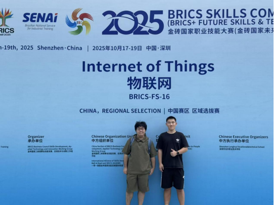 2025年10月17日-10月18日,由金砖国家工商理事会主办的2025金砖国家职业技能大赛(金砖国家未来技能和技术挑战赛)物联网赛项在深圳市龙华职业技术学校圆满落幕。由人工智能与数据学院王家豪和赖伟科老师指导的张晋、陈文豪两名同学,以第20名的优异成绩荣获省三等奖,为广州华商职业学院再添荣耀。此次参赛是学院物联网专业竞赛领域的再次获奖。
