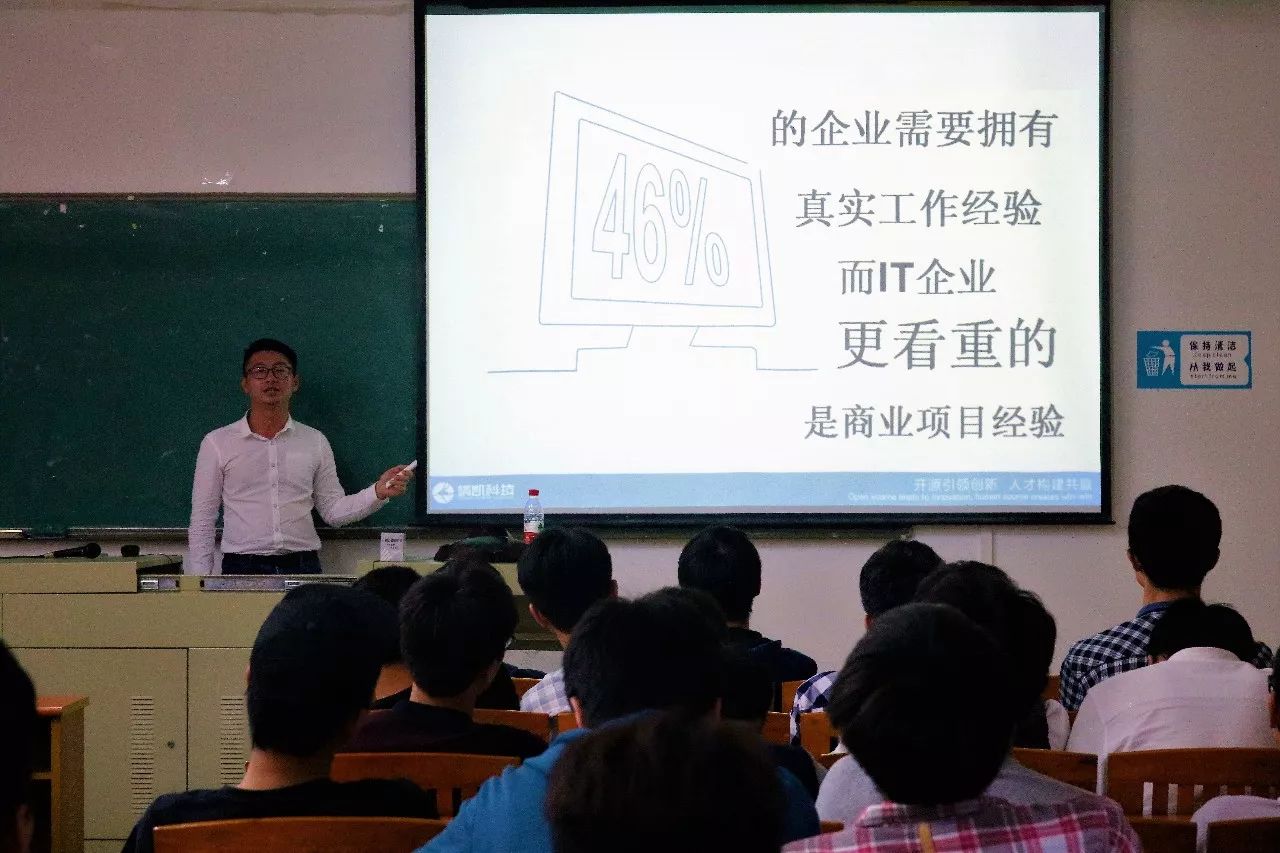 短短的宣讲会,郑讲师却说得很详细,他希望能有更多的大三毕业学生来到他公司里发展,他公司也准备了为期四个月的培训等。最后,郑讲师宣布这次讲座会结束,希望靖凯科技在这次招聘会中能圆满成功。