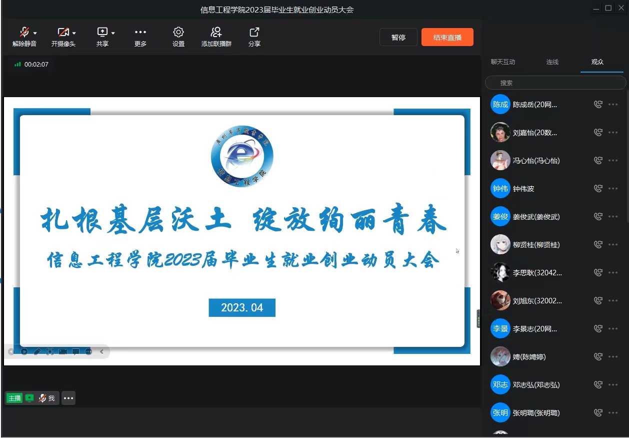 为落实学校关于2023届毕业生高质量就业工作的部署,根据广东省进一步引导和鼓励高校毕业生到基层工作的实施意见,以及国务院办公厅关于进一步鼓励大学生创新创业的指导意见,信息工程学院于2023年4月8日在线上开展主题为“扎根基层沃土,绽放绚丽青春”的2023届毕业生就业创业动员大会。参加本次动员大会的有信息工程学党总支副书记欧曼芸、征兵负责人赖勇计,以及2023届毕业班辅导员和全体毕业生。