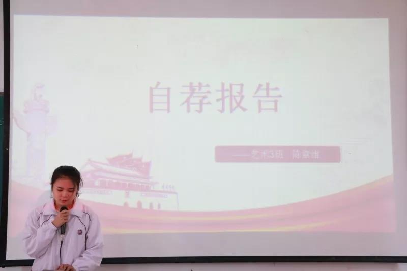 首先全体起立,面向党旗,奏国际歌;随之符合条件的入党积极分子依次上台自荐。此次大会共有梁晓琳等20名同学上台自荐。