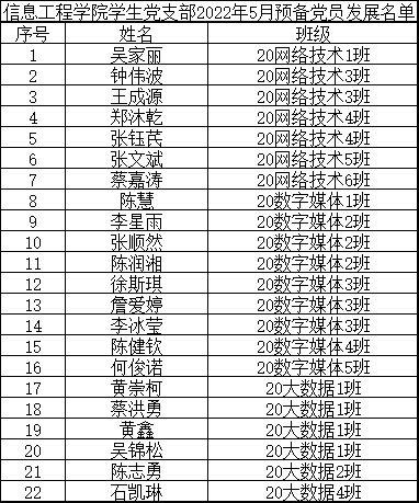 为增强发展党员工作的透明度,接受党内外群众监督,确保发展党员的质量,根据《中国共产党章程》和《中国共产党发展党员工作细则》的相关规定,经支部培养教育和考察,拟近期讨论接收吴家丽等22名同志为中共预备党员,现将名单公示如下: