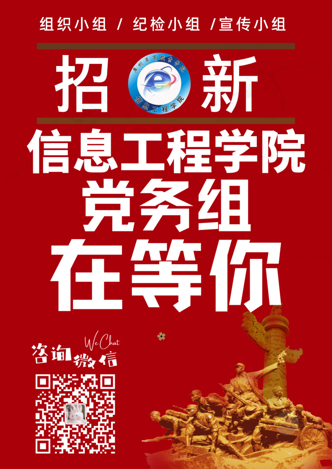 信息工程学院党务组是在信息工程学院党总支学生党支部指导下,主要负责处理我院党建日常工作的团体组织。主要负责我院师生的党建工作事务,目前下设组织小组、纪检小组、宣传小组等三个部门。