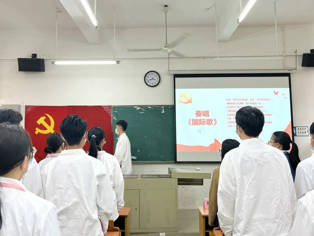 会议第一项议程,全体起立,面向党旗,奏唱《国际歌》。