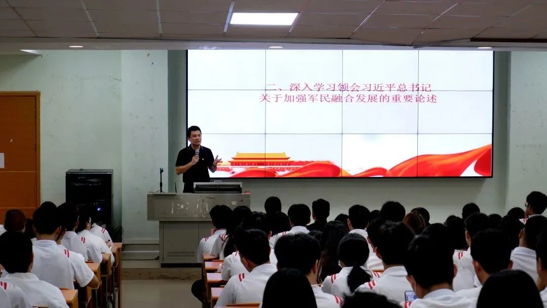 他将理论联系实际,生动形象地列举了我校关于国防教育融合校园建设的探索实践,他在鼓励我院学子培养爱国情怀,积极参与学校组织的国防教育活动的同时,呼吁同学们抓住机会响应征兵号召,为国防建设事业贡献力量。