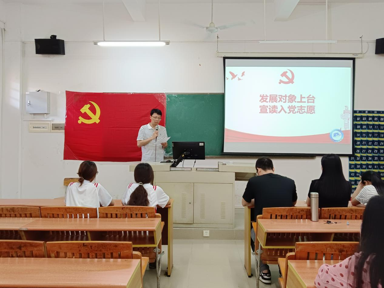 随后,由发展对象王道宽上台宣读入党志愿。他分别从思想、行动、科研等方面向党组织进行汇报,接着他表明在今后将坚定入党初心,以党员的高标准严格要求自己。