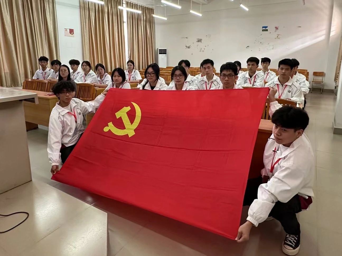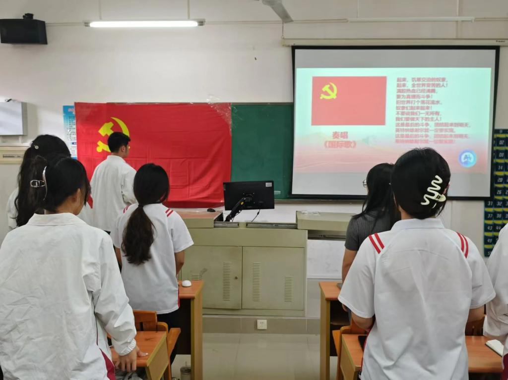 全体起立,面向党旗,奏唱《国际歌》。