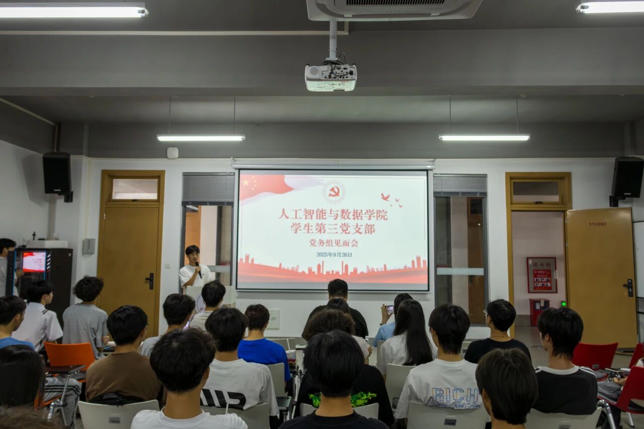 为加强学院党务队伍建设,提升党务组25级干事的组织凝聚力与责任意识,9月26日江门校区人工智能与数据学院学生第三党支部党务组在启超书院博雅讲演厅召开第一次见面会。会议由组织部组长林如斌主持,指导老师、部门组长、全体新成员齐聚一堂,共同开启新的篇章。