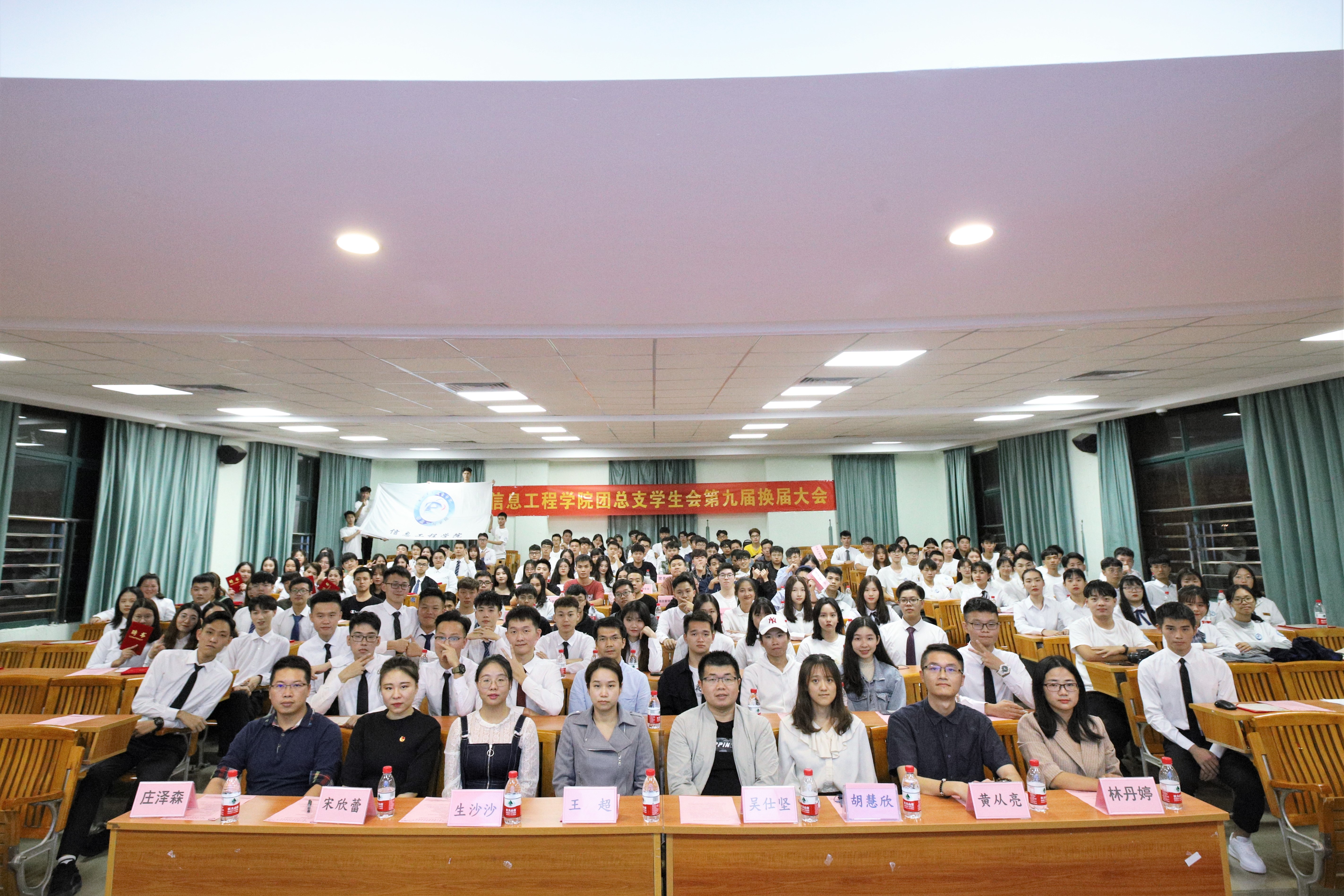主持人宣布大会开始及介绍到场嘉宾,莅临本次大会的嘉宾有信息工程学院王超副院长,党支部书记兼学工负责人吴仕坚老师,党支部副书记生沙沙老师,第九届团总支书记黄从亮老师,第八届团总支书记宋欣蕾老师,辅导员胡慧欣老师,专任教师林丹婷老师、周成就老师,班主任庄泽森老师以及团总支学生会第八届、第九届全体学生干部成员,党务组成员代表和各二级院系代表。