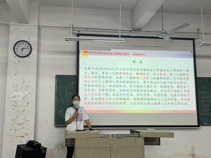 《广大青年成长成才要励志勤学、加强磨练》是2017年5月3日习近平同志在中国政法大学座谈会上讲话的一部分。通过吴欣瑶老师的讲解,学员们认识到“青年一代的理想信念、精神状态、综合素质,是一个国家发展活力的重要体现,也是一个国家核心竞争力的重要因素”。此外,老师还给大家分析了掌握和践行青年成长成才的六大要领:理想信念、学习、术业专攻、创新、勤奋、德才兼备,期待大家从六大要领中有所收获。