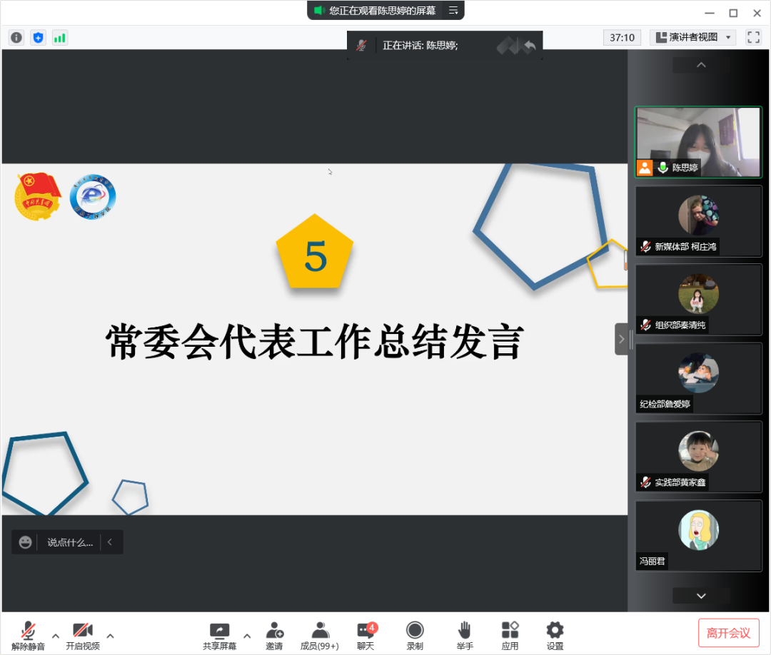 会议第五项议程,常委会代表工作发言总结。常委会代表总结了过去工作的开展情况并表示希望在接下来的活动中大家都积极参与到其中。