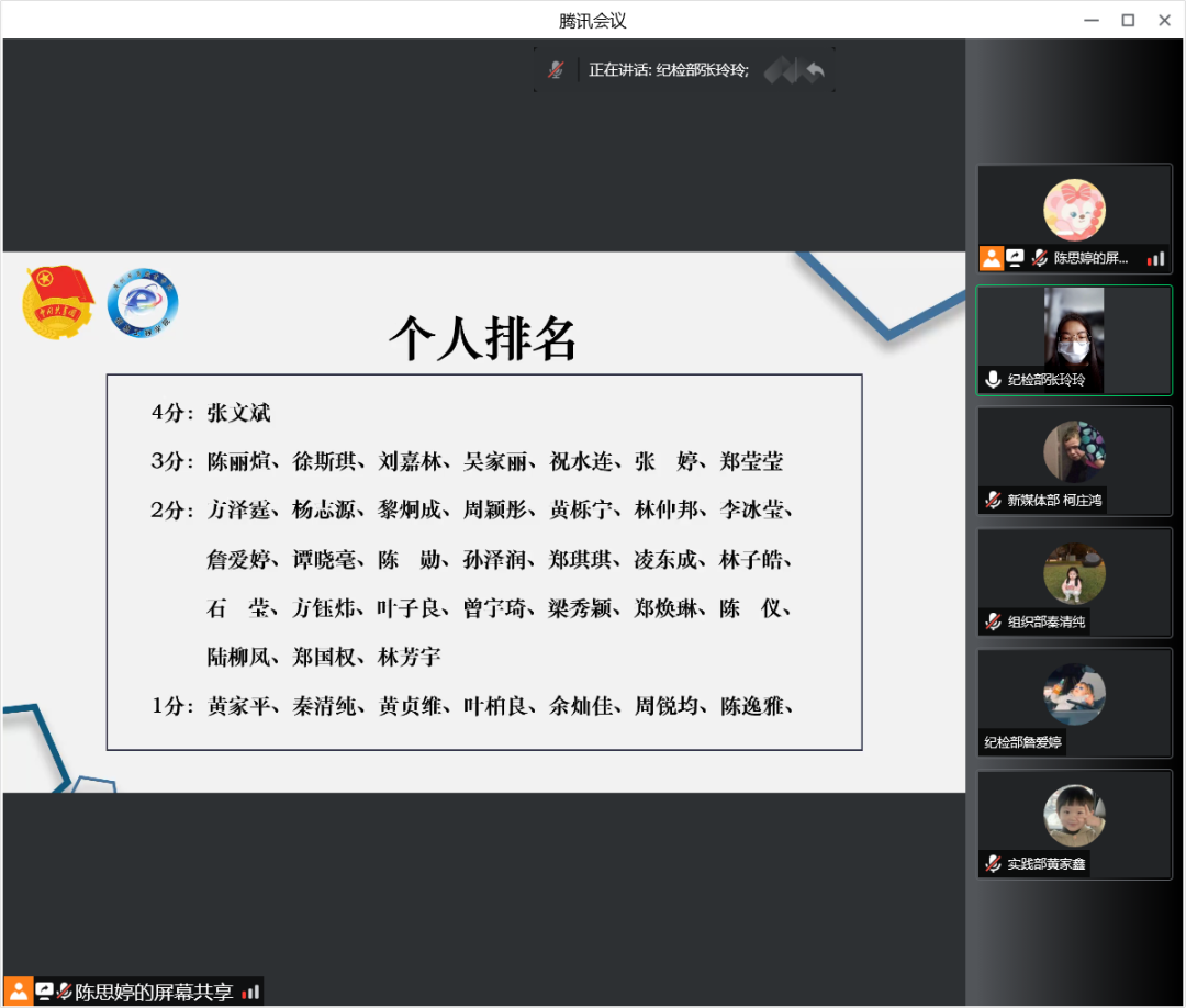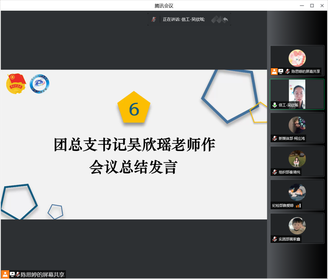 2022年5月26日中午,共青团广州华商职业学院信息工程学院总支委员会2021-2022学年度5月总结会议在线上成功召开,参与本次大会的人员有:信息工程学院团总支书记吴欣瑶老师及全体团学成员。本次会议由常委会秘书长陈佳婷同学主持。
