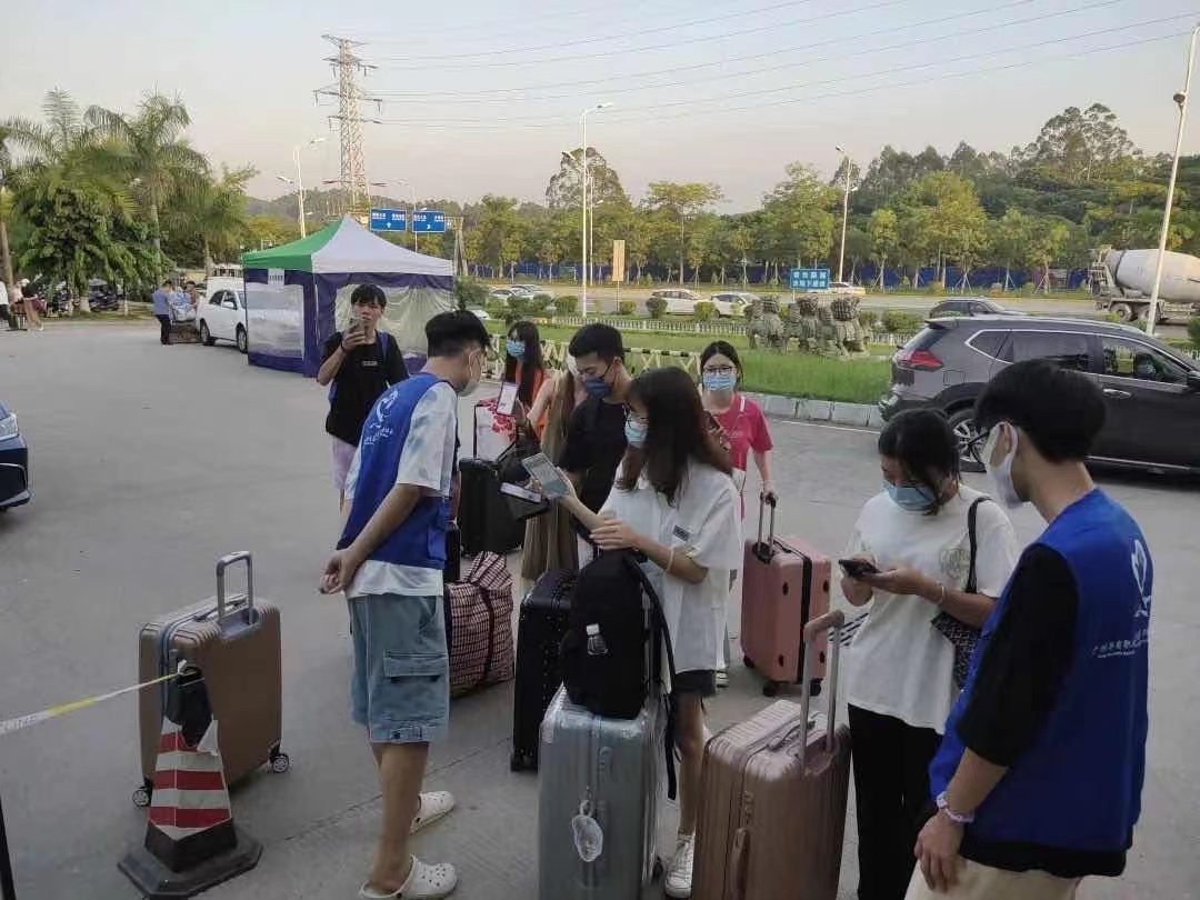 工作开始前,老师安排志愿者们岗位及做岗前培训。随后,志愿者为同学测量体温,检查粤康码、通行证及核酸状况,接下来,志愿者帮助同学核销健康卡。在“蓝马甲”志愿者们热情帮助下,同学有序进入校园,各项工作顺利完成。