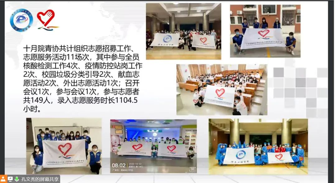 广州华商职业学院信息工程学院青年志愿者协会于2022年11月4日开展线上10月月度总结大会参加此次会议有信息工程学院团委副书记吴欣瑶老师以及广州华商职业学院信息工程学院21级青年志愿者协会理事会、代理部长及22级青年志愿者协会全体干事本次会议由孔文秀同学主持。