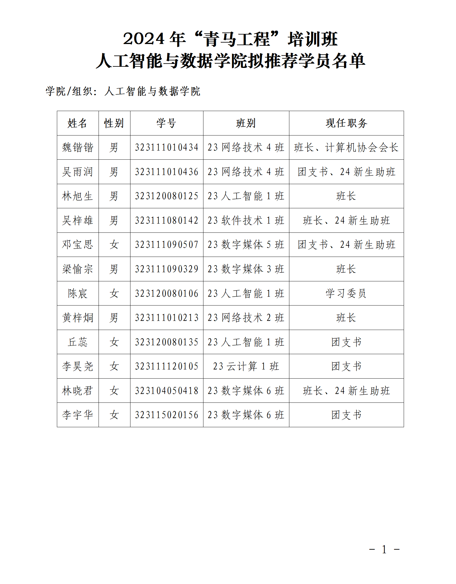 为深入贯彻落实党的二十大精神和习近平新时代中国特色社会主义思想,扎实推进青年马克思主义者培养工程,着力培养造就一批用马克思主义中国化最新成果武装的青年马克思主义者,人工智能与数据学院启动了青年马克思主义者培养工程学员选拔工作。 经个人申请、班级推荐、学院审核等环节,现将拟推荐参加广州华商职业学院青年马克思主义者培养工程的学员名单予以公示: 公示时间为2024年10月18日至2024年10月20日。如对公示名单有异议,请在公示期内以书面形式向学院团委反映。反映情况要实事求是,具体真实。 联系人:吴欣瑶 联系电话:020-82668092 工作办公室:博学楼A409 共青团广州华商职业学院人工智能与数据学院委员会 2024年10月17日 图文:陈早怡 初审:李美汝 复审:吴欣瑶 终审:叶锐