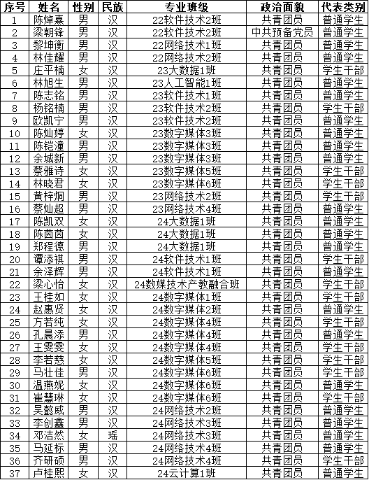 根据《中华全国学生联合会章程》《广东省学生联合会章程》《广州华商职业学院人工智能与数据学院学生会章程》的有关规定,结合学院学生会工作实际,拟定于2024年12月上旬召开广州华商职业学院人工智能与数据学院第一次学生代表大会。现将学生代表名单公示如下: