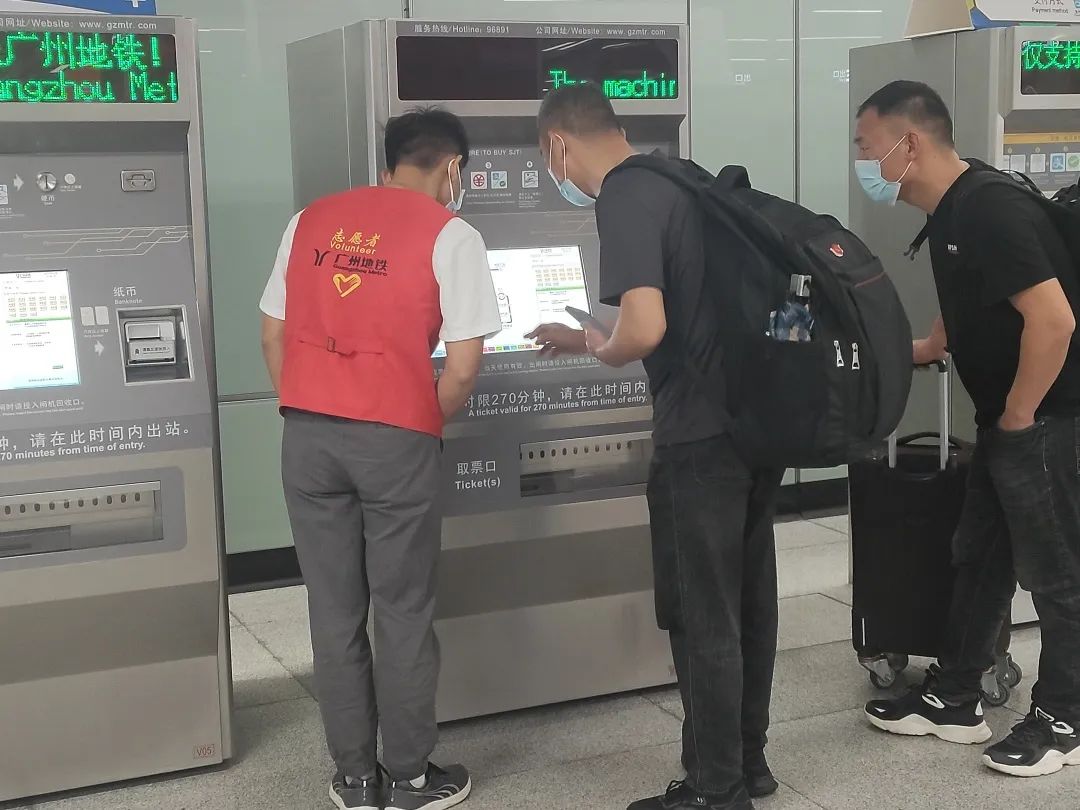 在服务过程中,志愿者们为乘客热情服务,协助工作人员为来往的乘客提供帮助,志愿者耐心教乘客如何正确使用购票机。礼貌友好地帮助乘客。