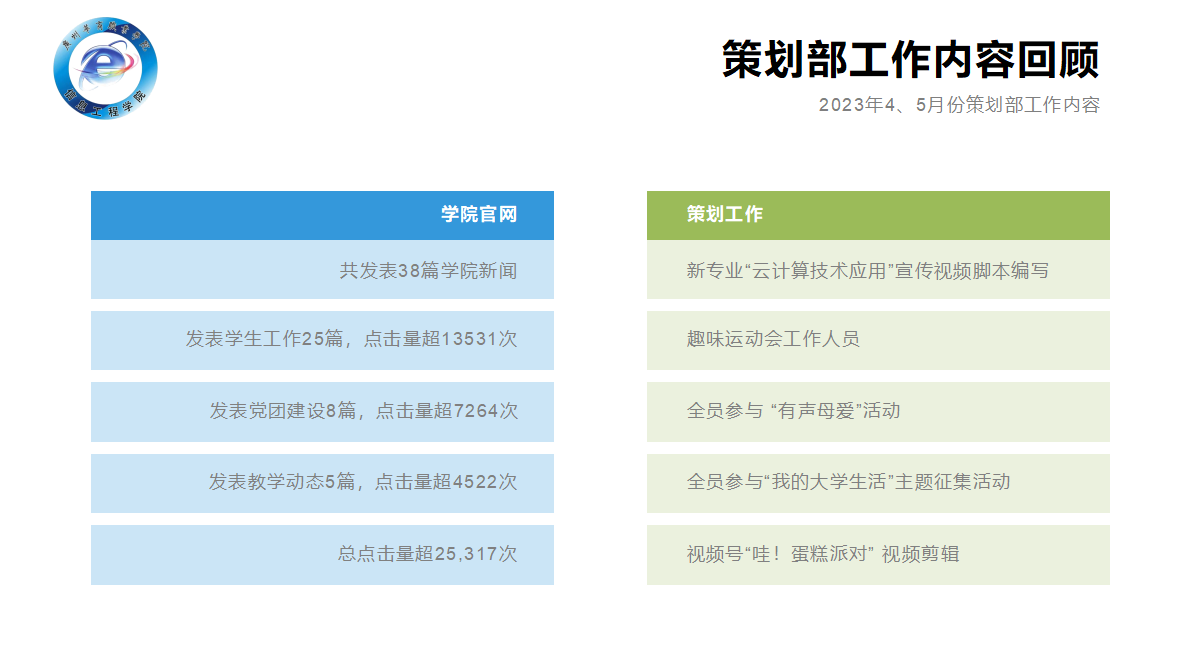 蔡棣熹首先对他们部门两个月以来的工作进行了汇报,他们在4-5月发表的学院新闻,其中涵盖了学院各个方面的动态、新闻和活动,涉及到学院的师生活动、学术成果、校园文化建设等方面,内容丰富、形式多样,总点击量超过了2.1万次,为学院宣传推广工作做出了积极的贡献;在趣味运动会中,他们部门的同学负责对接拍摄部与院团委学生会工作人员、在新专业“云计算技术应用”介绍视频中负责脚本编写、在“有声母爱”活动中全体策划部成员都有参与。同时,他指出部门成员存在积极性较低的问题。