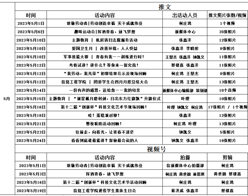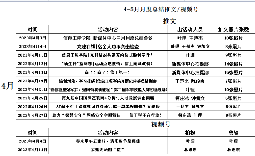 黄世钿首先汇报了拍摄部4-5月参加的活动、拍摄照片的数量以及发布视频号的工作情况。