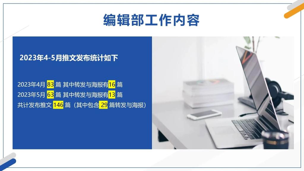 郑琪琪首先分析了4-5月公众号推文的情况。接着,她提到由于之前编辑部撰写推文会出现一些问题,但在4-5月期间,编辑部有针对推文类存在的问题进行了相对应的处理方法,推文的时效性明显较之前有显著提高,得到了较好的反馈结果。