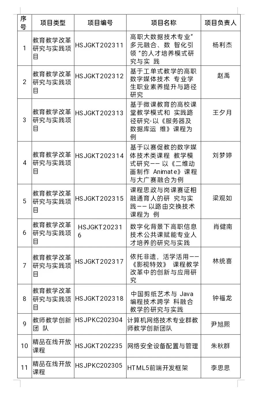 根据《关于公布 2023 年校级教育教学质量与教学改革工程(第一批)项目立项名单的通知》(华职教务〔2023〕44号)、《关于公布 2023 年校级教育教学质量与教学改革工程(第二批)项目立项名单的通知》(华职教务〔2023〕59 号)文件精神,为充分论证项目的可行性和研究目标的有效性,2023年9月25日下午,信息工程学院以线上和线下相结合的方式在会议室博B407召开了2023年校级教育教学质量与教学改革工程项目开题报告会议。